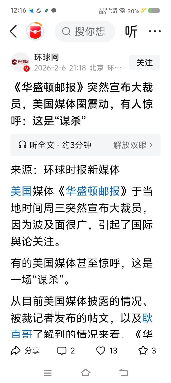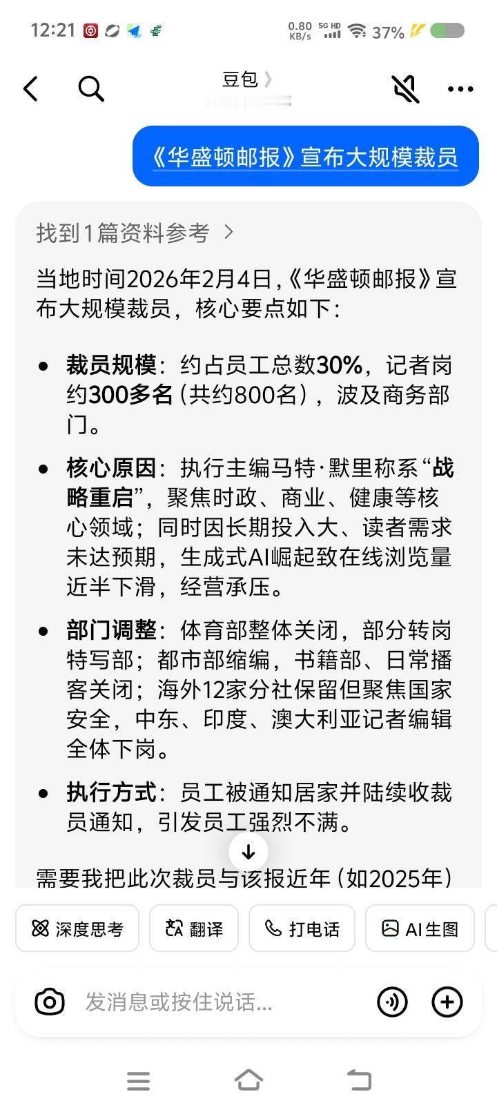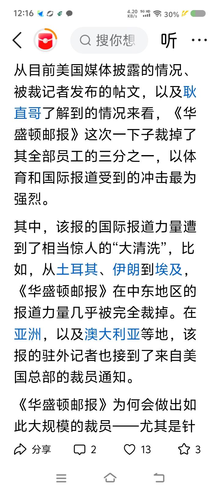 美国某报业大裁员—— 据报道,《华盛顿邮报》裁去三分之一的记者,体育和国际报道受灾严重,驻中东、印度、澳大利亚等地的受影响大。 原因有三种分析:一、美国注意力内转。二、老板取悦特朗普,干涉媒体业务,读者量下滑。三、传统媒体不景气。 点评: 直接原因呢? “贝贝。” “老板好。” “叫我‘总统先生’。” “您说。” “文件披露了那么多,让他们晕头转向,很好。那个食ren图黑块,绝了!这叫‘欲盖弥……’不对,这叫……反正,好!” “下一步呢?” “再说吧。你家人口太多了。省点米。” “你……”