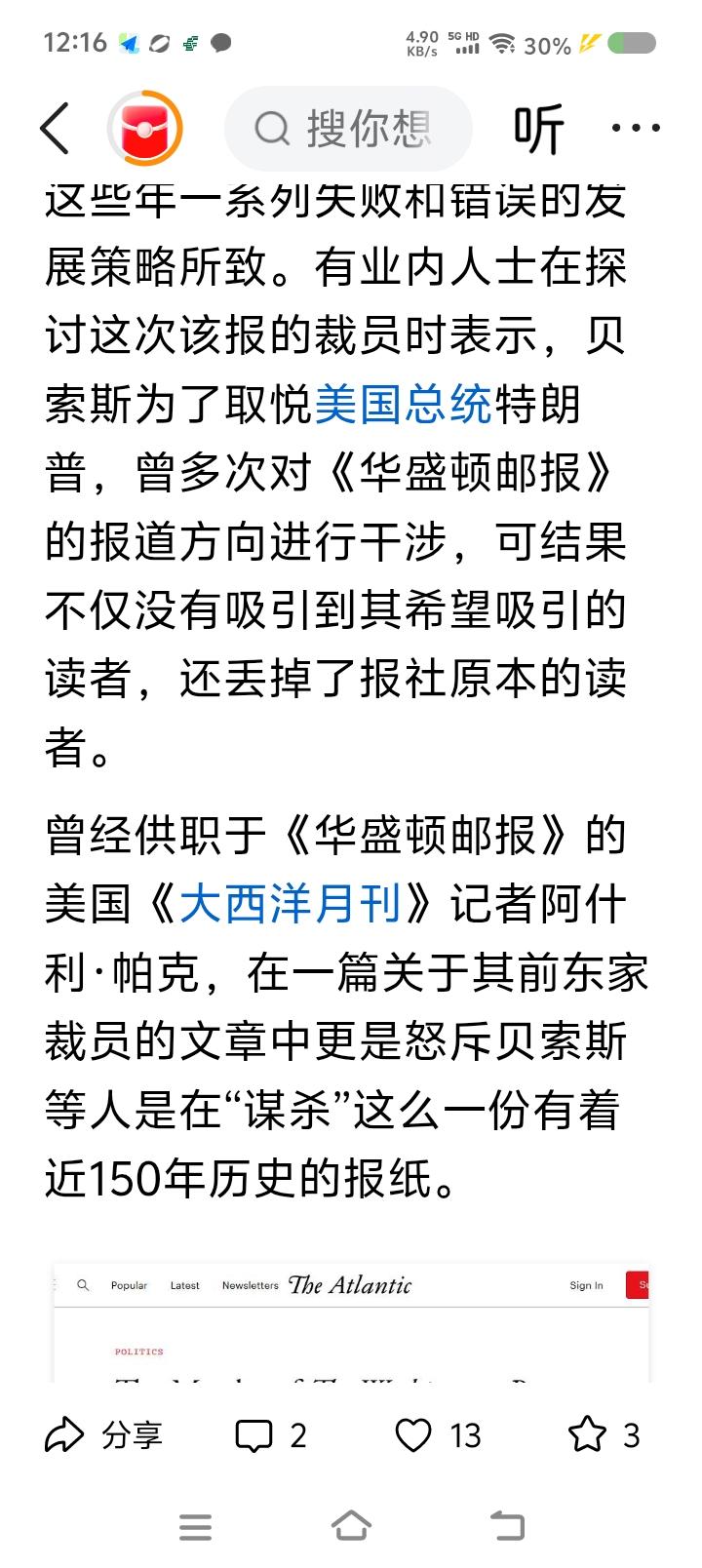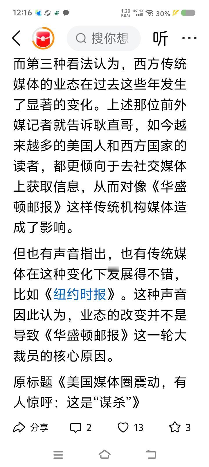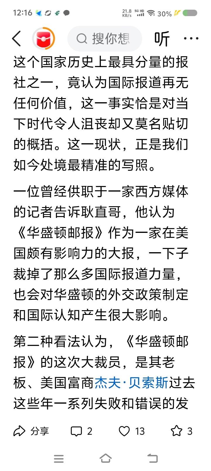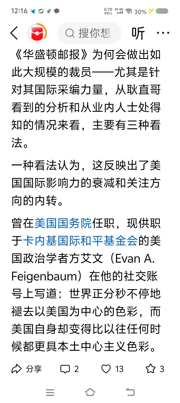美国某报业大裁员—— 据报道,《华盛顿邮报》裁去三分之一的记者,体育和国际报道受灾严重,驻中东、印度、澳大利亚等地的受影响大。 原因有三种分析:一、美国注意力内转。二、老板取悦特朗普,干涉媒体业务,读者量下滑。三、传统媒体不景气。 点评: 直接原因呢? “贝贝。” “老板好。” “叫我‘总统先生’。” “您说。” “文件披露了那么多,让他们晕头转向,很好。那个食ren图黑块,绝了!这叫‘欲盖弥……’不对,这叫……反正,好!” “下一步呢?” “再说吧。你家人口太多了。省点米。” “你……”
