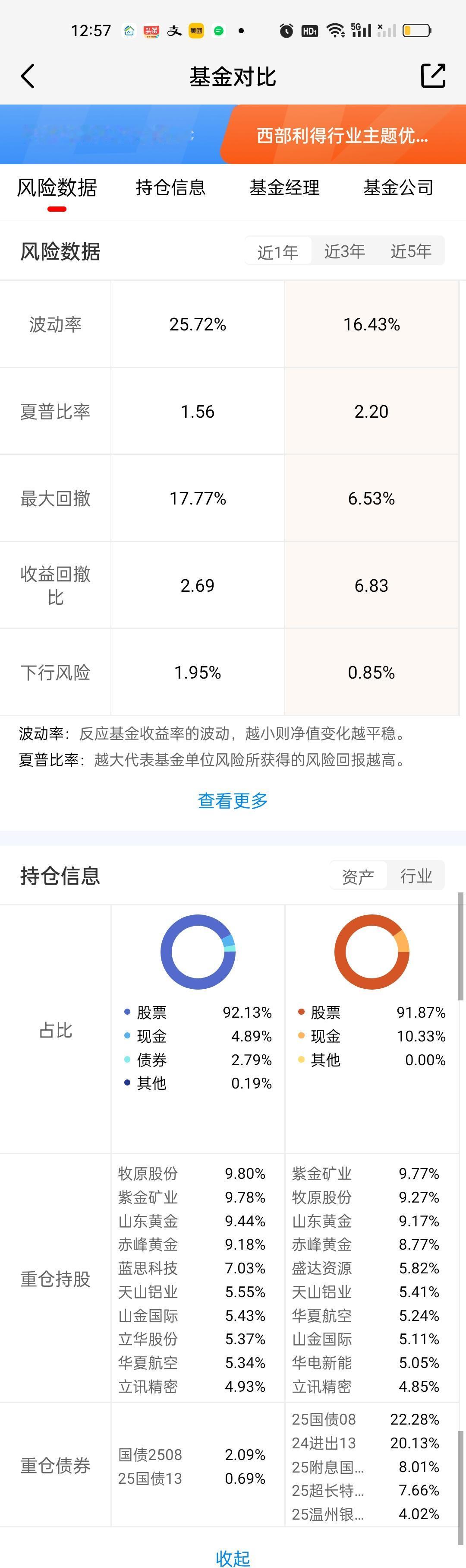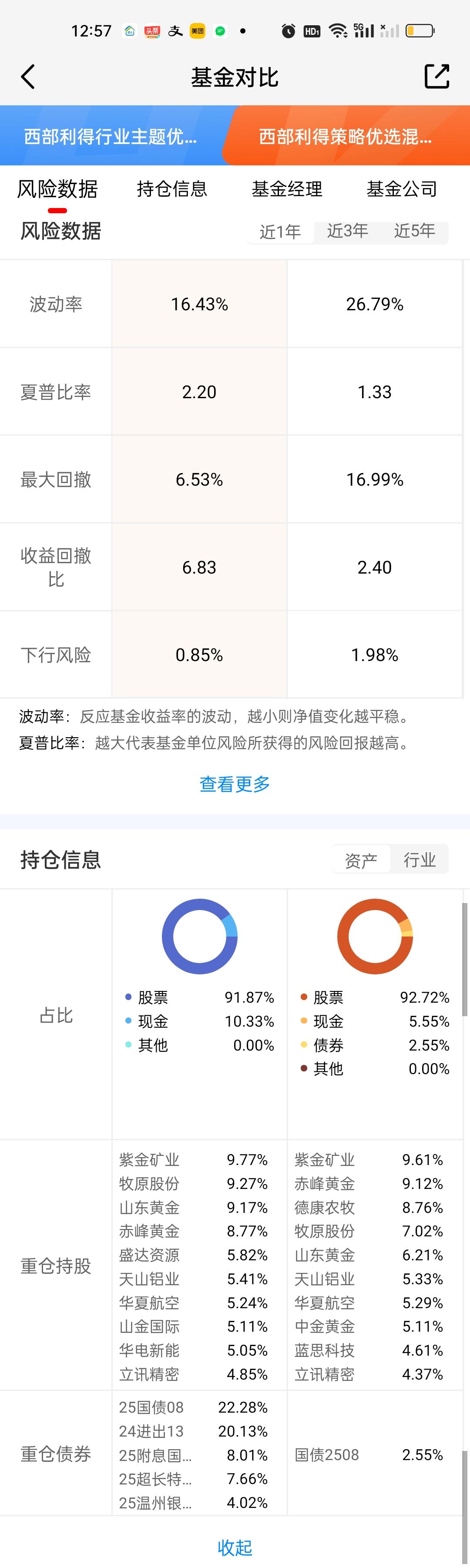 今年以来与近1个月来统计日期是高度重合的,所以我们这里拿来一起讲。西部利得这几只我半个月之前也有重点介绍过。 西部利得三兄弟是最大的赢家,西部利得策略优选,西部利得新动力,西部利得行业主题是仅有的今年以来收益率在40%以上,近1个月以来收益率在34%以上的基金。其实三只基金收益和持仓是差不多的,前十大重仓股基本10只有8只是重合的。所以没有必要全都拿着。从风险数据对比来看,行业主题最大6.53%的回撤确实太过亮眼。