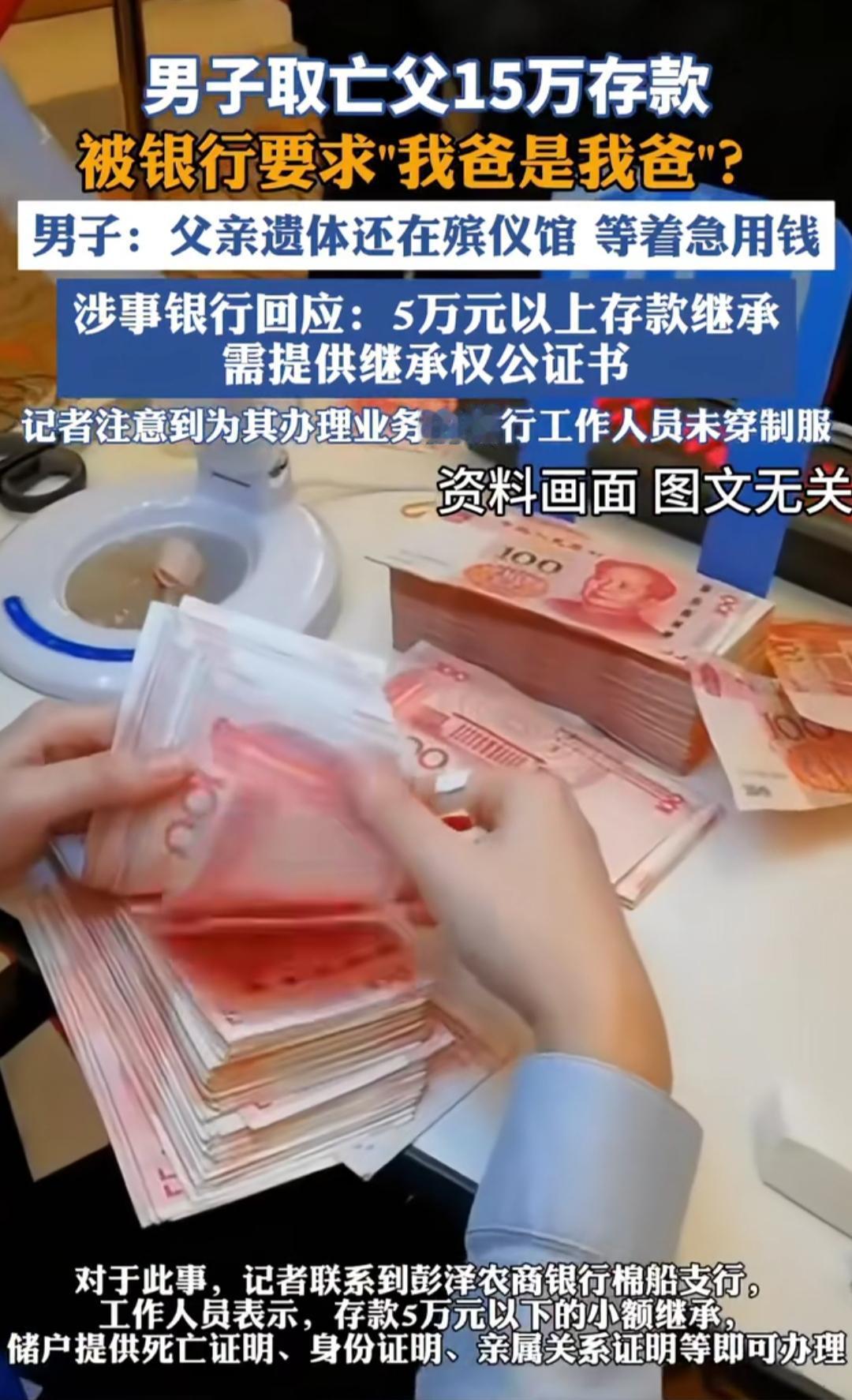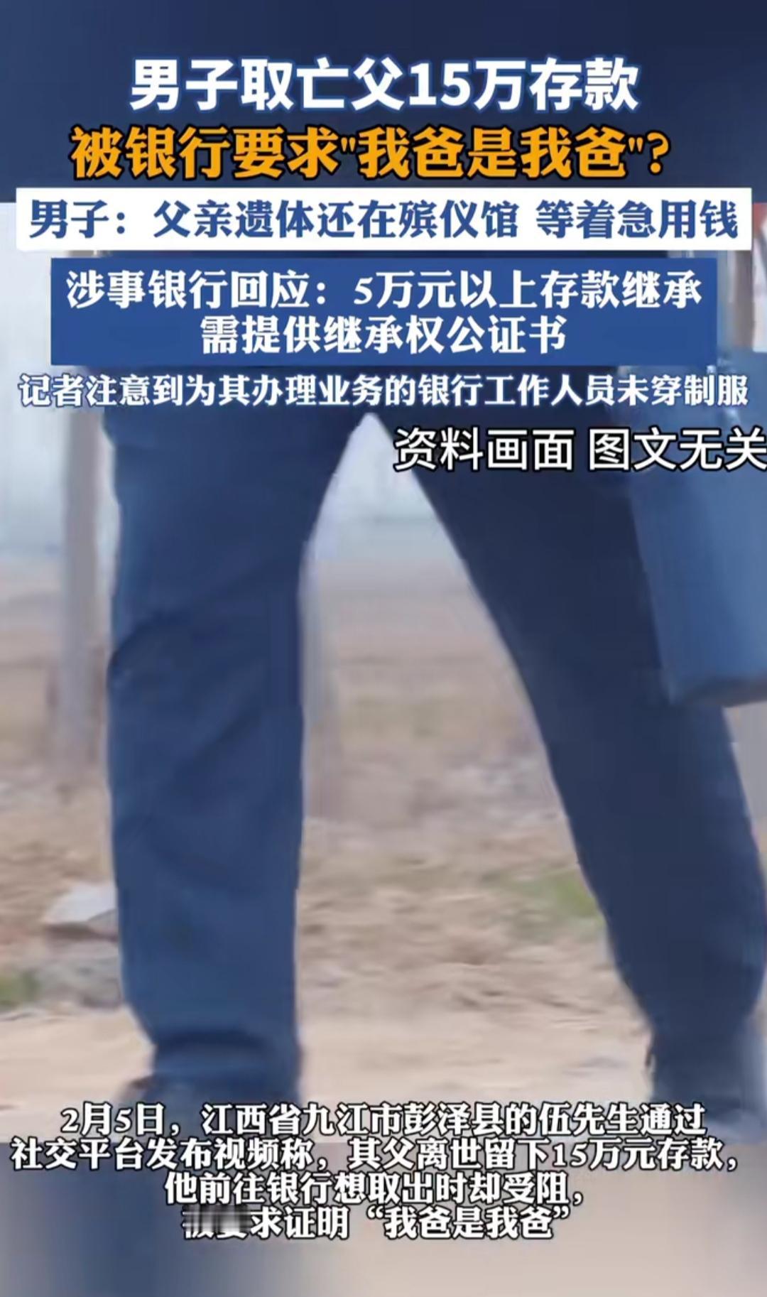 谁能想到,至亲离世后,取个父亲留下的存款还能遇上糟心事!江西一位网友的经历太戳心了,老父亲走后留下15万存款,本是亲人留下的念想,可到银行支取时,却被要求证明“我爸是我爸”,换谁心里都堵得慌。 任谁遇到这种事,怕是都要懵圈。血脉亲情本是最真切的联结,可到了办事环节,却要拿出一纸证明来佐证,一边是失去亲人的悲痛,一边是办事的繁琐,这份无奈真的感同身受,也让人忍不住琢磨,这样的证明真的有必要吗? 目前涉事银行已经针对这件事作出了回应,只是具体的回应内容暂未透露。这件事也让不少人联想到自己遇到的类似办事难题,关于亲属离世后存款支取的流程,也再次引发了大家的关注和讨论。