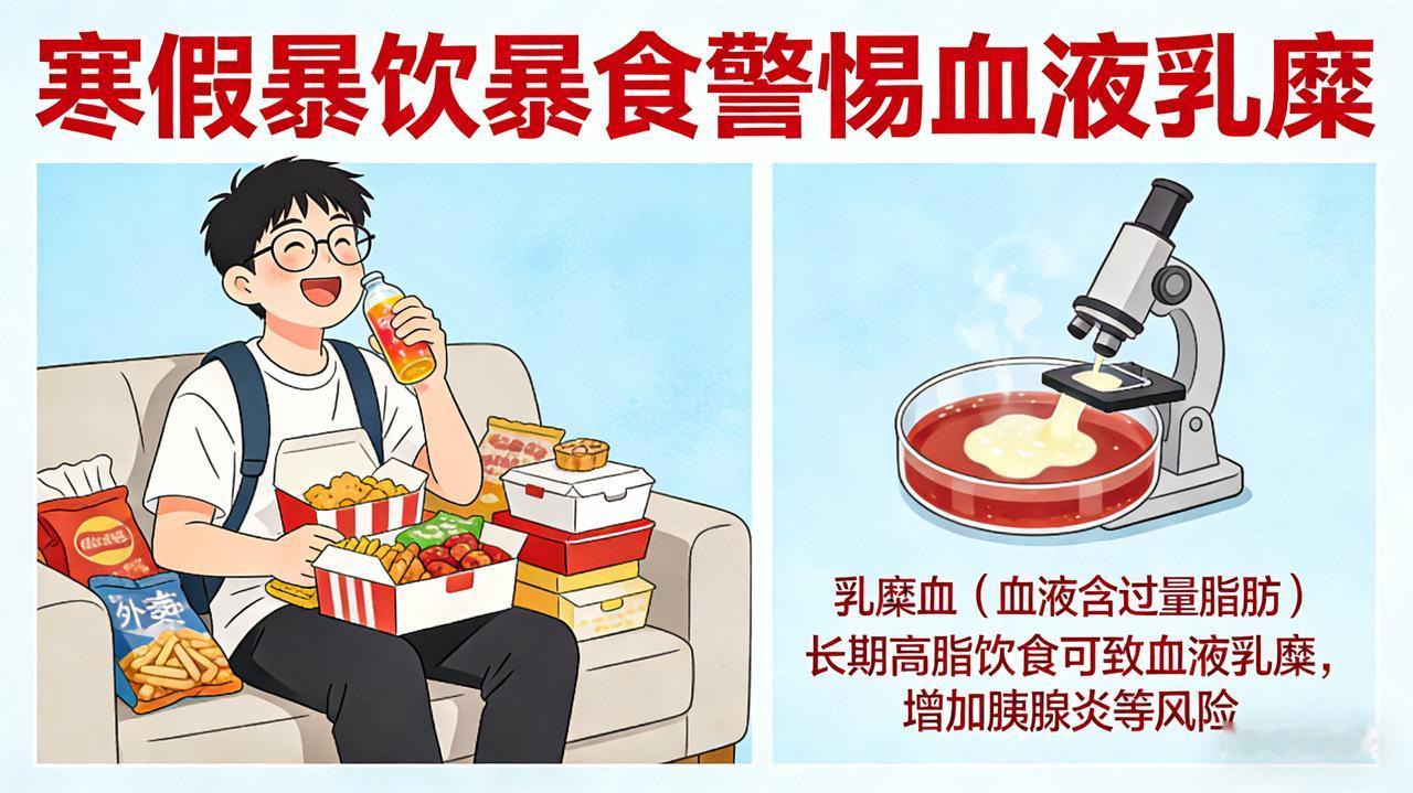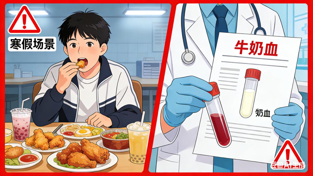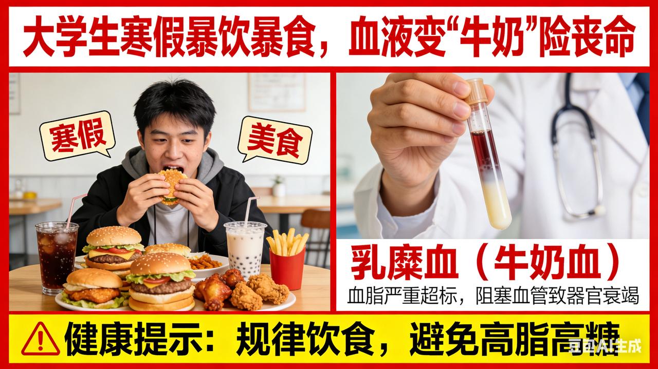 大学生寒假暴饮暴食,血液变 "牛奶" 险丧命 寒假“狂欢”酿苦果:大学生凌晨腹痛,血液惊变“牛奶色” 当寒假的大幕缓缓拉开,对于大学生而言,这无疑是一场期待已久的自由盛宴。然而,20岁的小李却在这场看似欢乐的假期“狂欢”中,遭遇了一场突如其来的健康噩梦,让他深刻领悟到了放纵饮食的沉重代价。 小李一回到家中,便彻底摆脱了学校生活的约束,开启了毫无节制的吃喝模式。每天清晨,温暖的被窝成了他最亲密的伙伴,早餐被他无情地抛诸脑后。午餐和晚餐时,餐桌上满是油光闪闪的大鱼大肉、香酥可口的油炸食品,再搭配上甜腻的高糖饮料,仿佛每一口都是对假期自由的尽情享受。夜晚,朋友间的聚餐成了他生活的重头戏,烧烤架上滋滋冒油的肉串、热气腾腾的火锅,让他大快朵颐。即便到了深夜,薯片、巧克力等零食也成了他消遣时光的“最佳拍档”。 然而,这种毫无规律的暴饮暴食,就像一颗定时炸弹,在小李的身体里悄然埋下了隐患。凌晨3点,一阵如刀绞般的剧烈腹痛突然袭来,将小李从睡梦中硬生生地拽醒。他蜷缩在床上,双手紧紧捂住肚子,冷汗如雨般不停地冒出来,脸色苍白得如同一张白纸。家人被他的痛苦呻吟惊醒,心急如焚地将他送往了医院。 在医院里,当医生抽出小李的血液进行检验时,眼前的景象让所有人都惊愕不已——原本鲜红流动的血液,此刻竟然变成了浑浊的乳白色,宛如一杯浓郁的牛奶,这在医学上被称为“乳糜血”。原来,小李长期不健康的饮食习惯,使得大量脂肪在体内疯狂堆积,身体根本无法及时消化和代谢这些过剩的营养。而凌晨时分,身体的各项机能处于相对低谷状态,过量的脂肪终于引发了急性胰腺炎,这才导致了那撕心裂肺的剧烈腹痛。 经过医生们的紧急救治和悉心照料,小李的病情逐渐稳定下来。但这次惊险的经历,就像一记响亮的警钟,在他心中久久回荡。他也在此提醒广大同龄人,寒假虽欢乐,但一定要珍惜自己的身体,保持规律的作息和健康的饮食习惯,切莫让一时的放纵,毁了自己宝贵的健康。