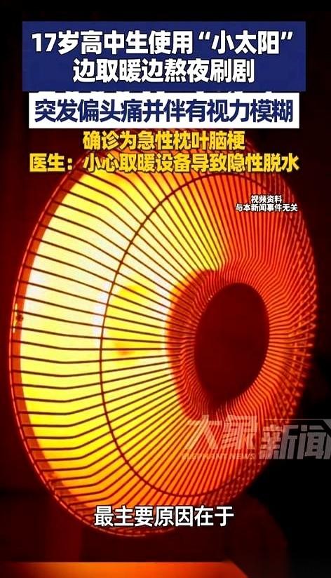 凶手是谁? 是那台摆在床边,烤得人浑身暖洋洋的小太阳。 真的,就这么魔幻。一个17岁的高中生,熬夜刷剧,怕冷,把取暖器放身边烤了几个小时,人就直接脑梗了。 我看到这个新闻的时候,后背都凉了。 你以为脑梗是老年病?是高血压糖尿病患者的专利? 错了。 现在的年轻人,正在用最舒服的姿势,一步步把自己送进急诊室。 你想象一下那个场景: 冬天,湿冷,把自己裹在被子里,旁边开着小太阳,暖风烘着,手里再捧着手机,刷着剧,吃着薯片,喝着可乐…… 这不就是我们每个人的冬日续命套餐吗? 太舒服了。 舒服到你都忘了,你的身体正在被“温水煮青蛙”。 那个小太阳,就是一台小型的抽水机。 它对着你烤,你身体里的水分,就这么被悄无声息地烤干了。你不出汗,但水分在蒸发。 然后你还不喝水,你喝的是可乐,吃的是薯片,高糖高盐,血液变得跟八宝粥一样粘稠。 最后你还久坐不动,蜷在那里几个小时。 好了,buff叠满了。 粘稠的血液,在痉挛的血管里,流不动了,堵住了。 BOOM。 脑梗。 一个17岁的孩子,右半边身体麻木,那得是多漫长痛苦的康复。 这代价,太大了。 别觉得这事儿离你远。 冬天懒得动,懒得喝水,是很多人的常态。 我们拼命追求的那些舒适和方便,有时候,真的会反过来咬你一口。 记住吧,朋友。 取暖器离远点,尤其是别对着头吹。 手边放杯温水,别等渴了再喝。 最重要的是,窝一个小时,好歹起来走两步,哪怕是上个厕所呢。 别让最舒服的姿势,成为最危险的陷阱。