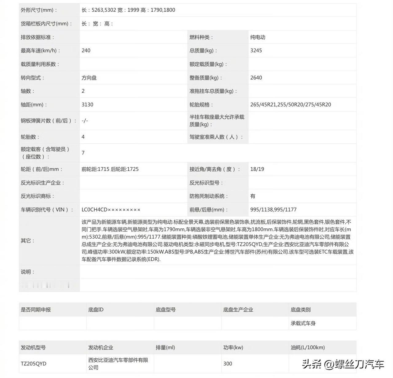 瞄准40万级别以上市场/上半年亮相!比亚迪大唐申报图曝光 2月6日,我们从最新一期工信部看到了比亚迪品牌旗下全新SUV——大唐申报信息。根据此前信息来看,该车内部定位9系产品,将成为王朝系列全新旗舰车型。同时,新车将在今年上半年亮相,瞄准40万级以上市场。 该车正是Dynasty-D概念车的对应量产车型,其长宽高分别为5263(5302)/1999/1790(1800)mm,轴距3130mm,这个数据大幅超越了原有的唐,也超过了理想 L9。当前暂时备案纯电车型,提供300kW和370kW两种功率的单电机以及215/370kW双电机的选项,其功率设定相较唐L EV更加克制。 值得注意的是该车将配备后轮转向,曾经由腾势易三方独占的特色功能正式下放至比亚迪本品牌。除了“大唐”外,王朝网后续还将推出“大汉”,比亚迪将再度尝试向上突破!如果真卖四十多万,大家会考虑吗?[灵光一闪]