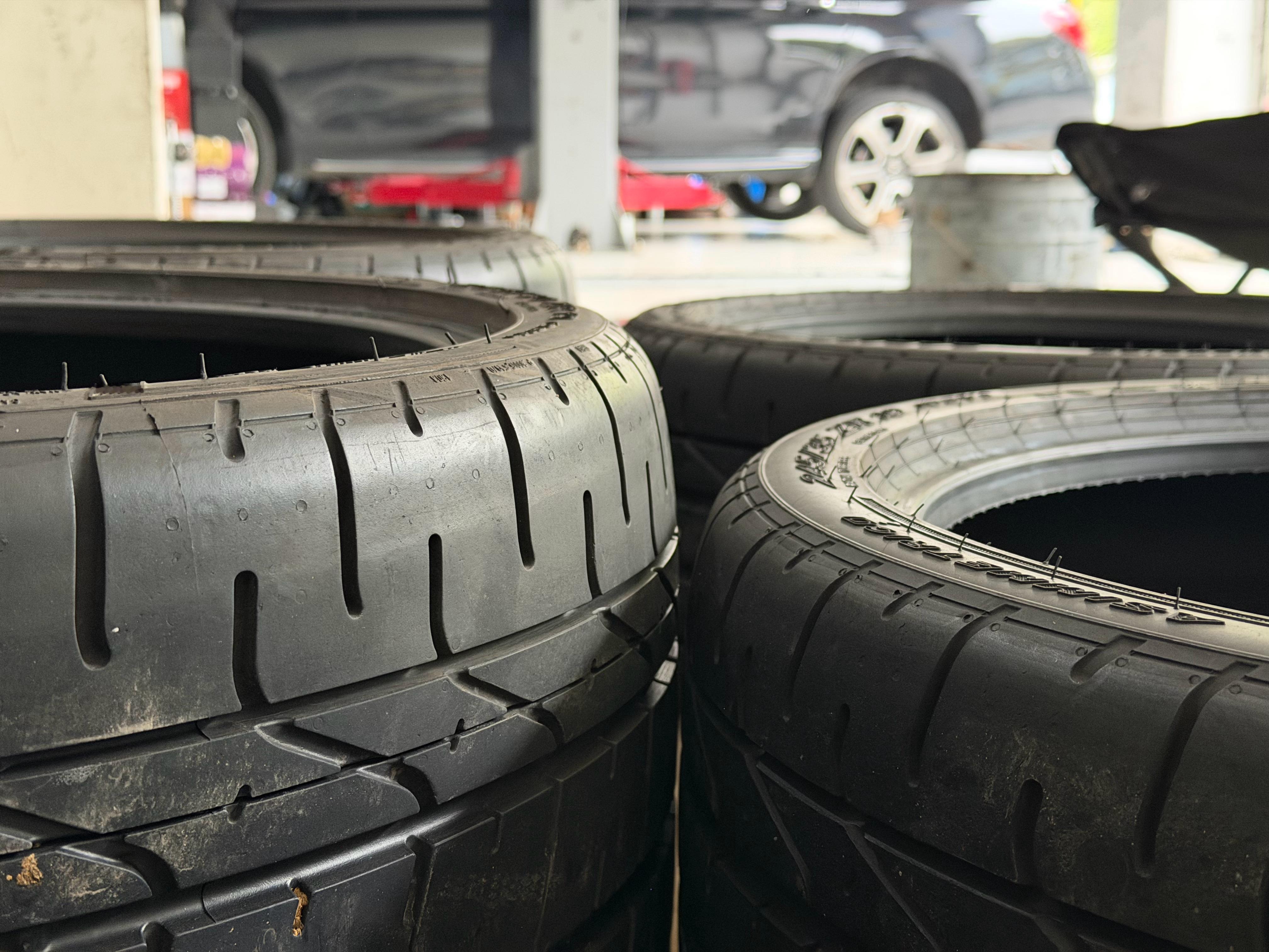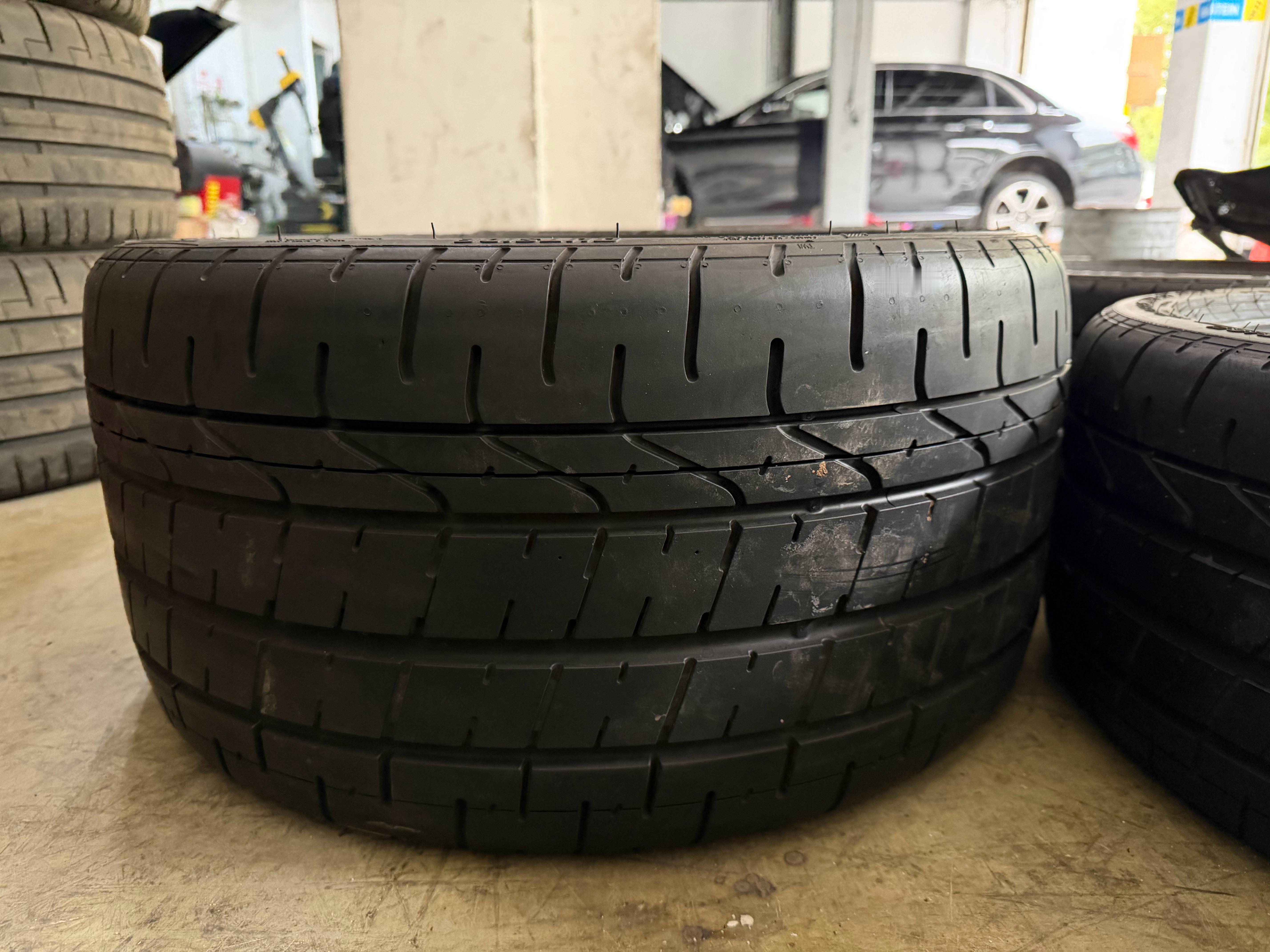 阿罗Giulia四叶草原配胎,前轮245后285,花纹看着不那么竞技,但耐磨才60。宝马M3 GTS原厂也是这个胎,星标,前255后285。栗子的e92m3