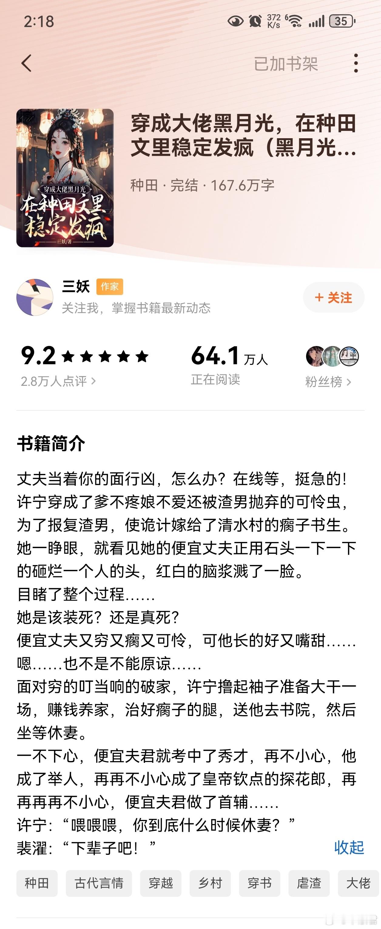 穿成大佬黑月光,在种田文里稳定发疯好看的,很有意思的一本文,里面有很多小故事,是意想不到的一种发展,原本以为只是简单的穿越文,穿书文,其实后面很不简单,而且作者一点不把古代人当傻瓜,很聪明的古代人言情小说推荐番茄好文