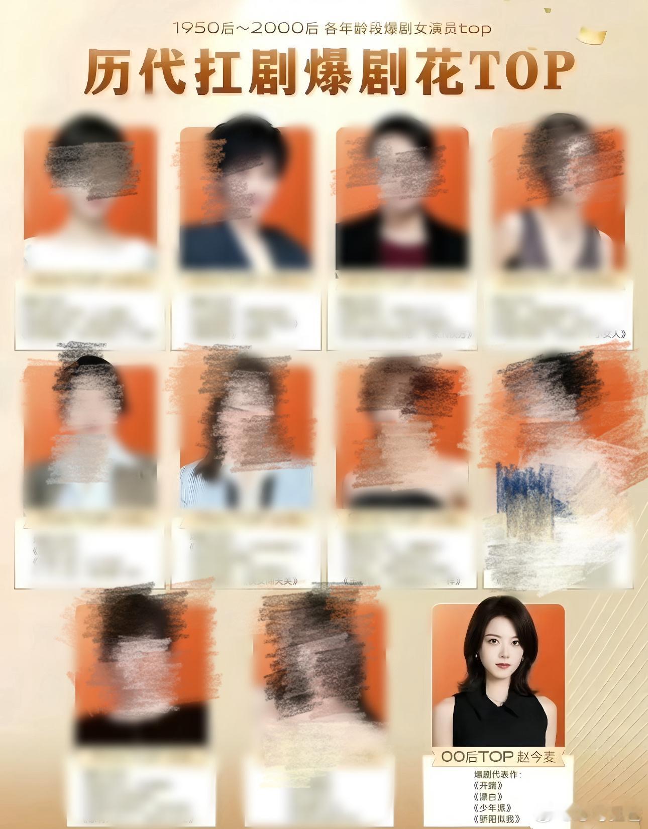 网友总结的1950后~2000后各年龄段爆剧女演员top,赵今麦以多部爆剧【开端】【漂白】【骄阳似我】【少年派】获得00后top 实至名归