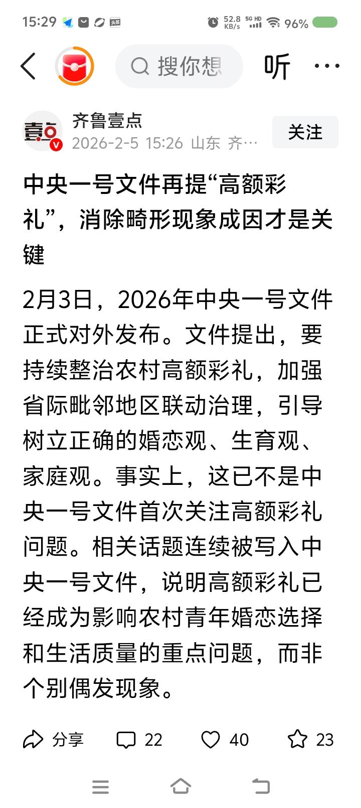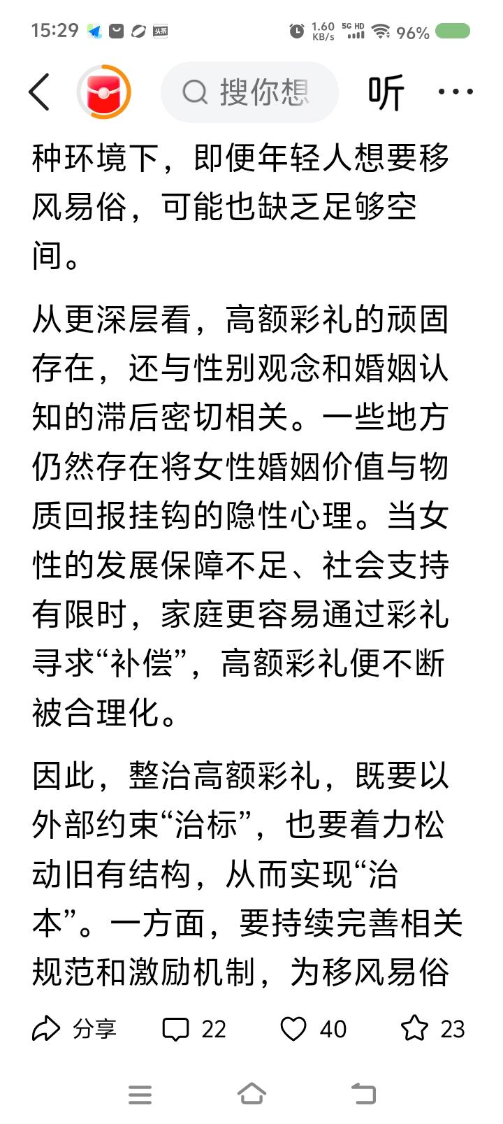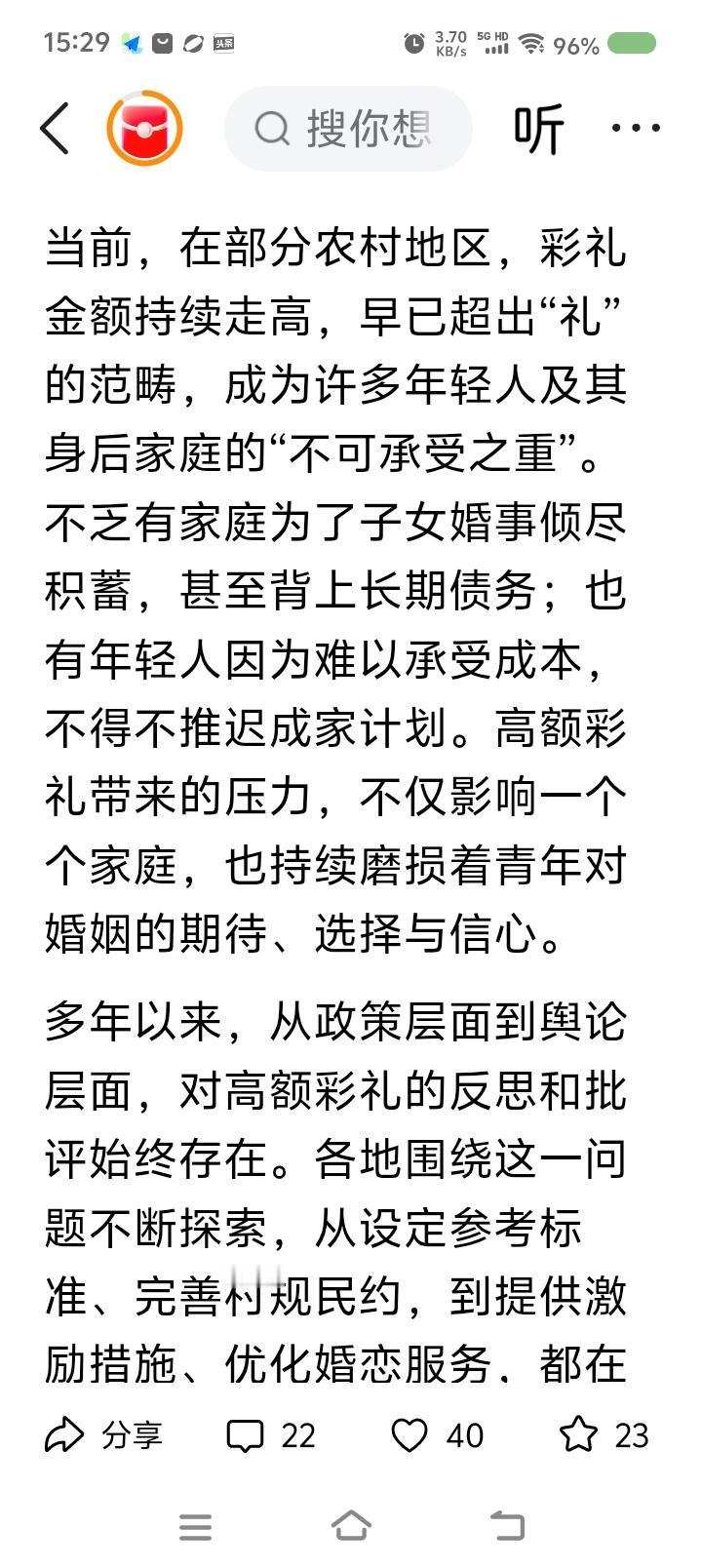 整治高彩礼了,你心动么?—— 据报道,一号文件提出,持续整治高彩礼,引导树立正确的婚恋观。 点评: 一、彩礼是我国风俗,高彩礼却是陋习,它加重了老百姓的负担,与我国国情不符。 二、为什么会有高彩礼?更严重的是,一些地区出高彩礼也不好找结婚对象。这是很大的经济问题和文化问题。