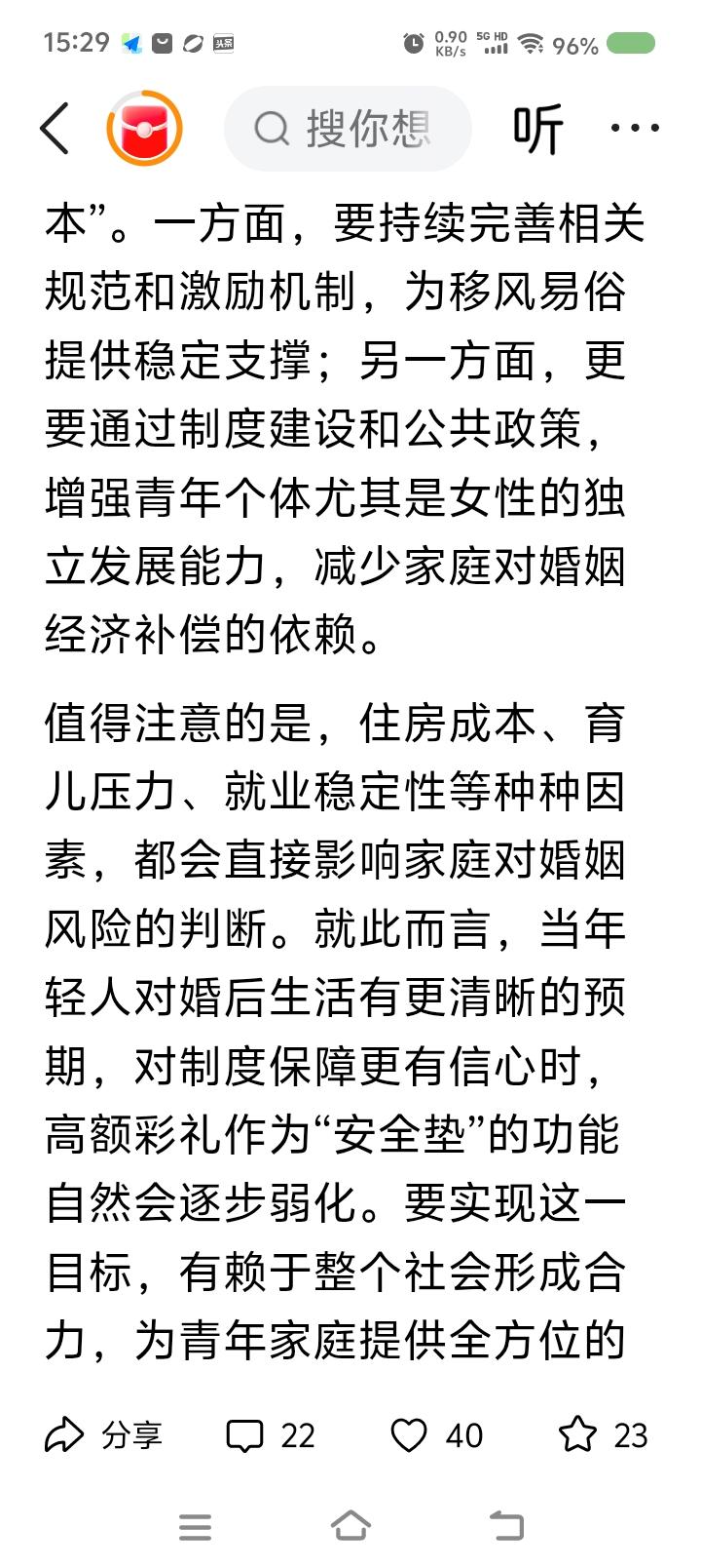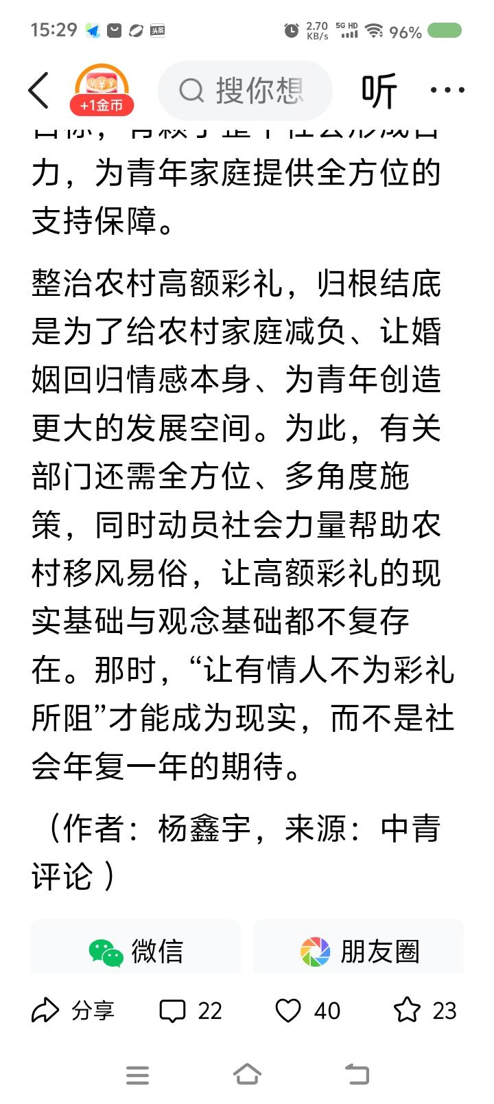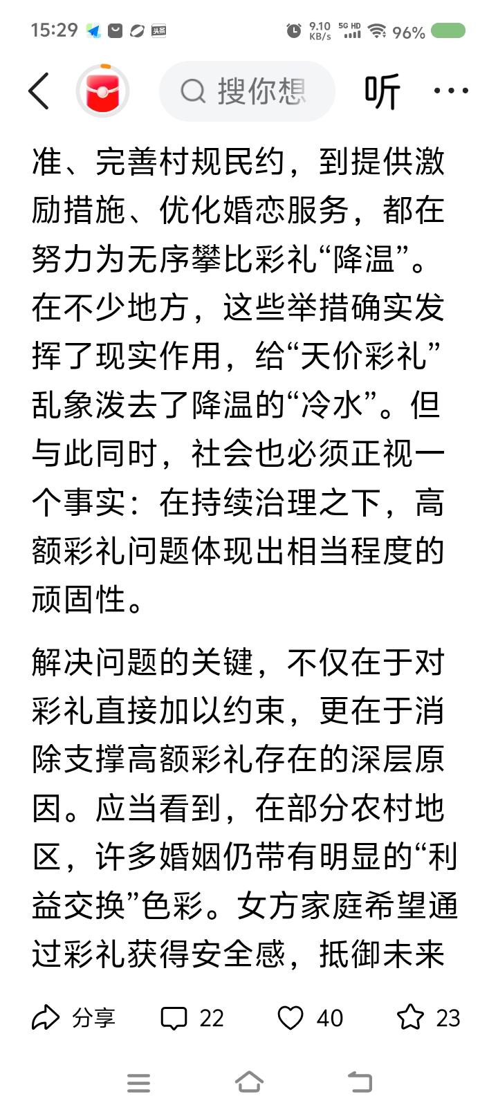 整治高彩礼了,你心动么?—— 据报道,一号文件提出,持续整治高彩礼,引导树立正确的婚恋观。 点评: 一、彩礼是我国风俗,高彩礼却是陋习,它加重了老百姓的负担,与我国国情不符。 二、为什么会有高彩礼?更严重的是,一些地区出高彩礼也不好找结婚对象。这是很大的经济问题和文化问题。
