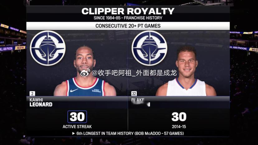 根据转播方的数据统计,伦纳德已经连续30场比赛砍下20+,就此追平格里芬,并列队史第六,而队史第一是鲍勃·麦卡杜的连续57场20+。