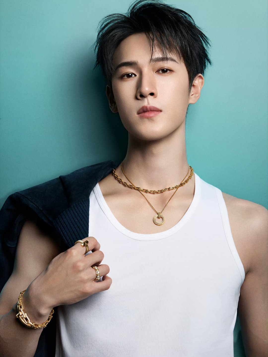 薄荷绿纯色背景,墨蓝丝绒夹克+鎏金珠宝配饰,部分造型卸下外套露出白背心,冷冽金属感配淡颜骨相,少年感与高级锋芒兼具,主打Tiffany经典系列珠宝 。李昀锐真的很优秀