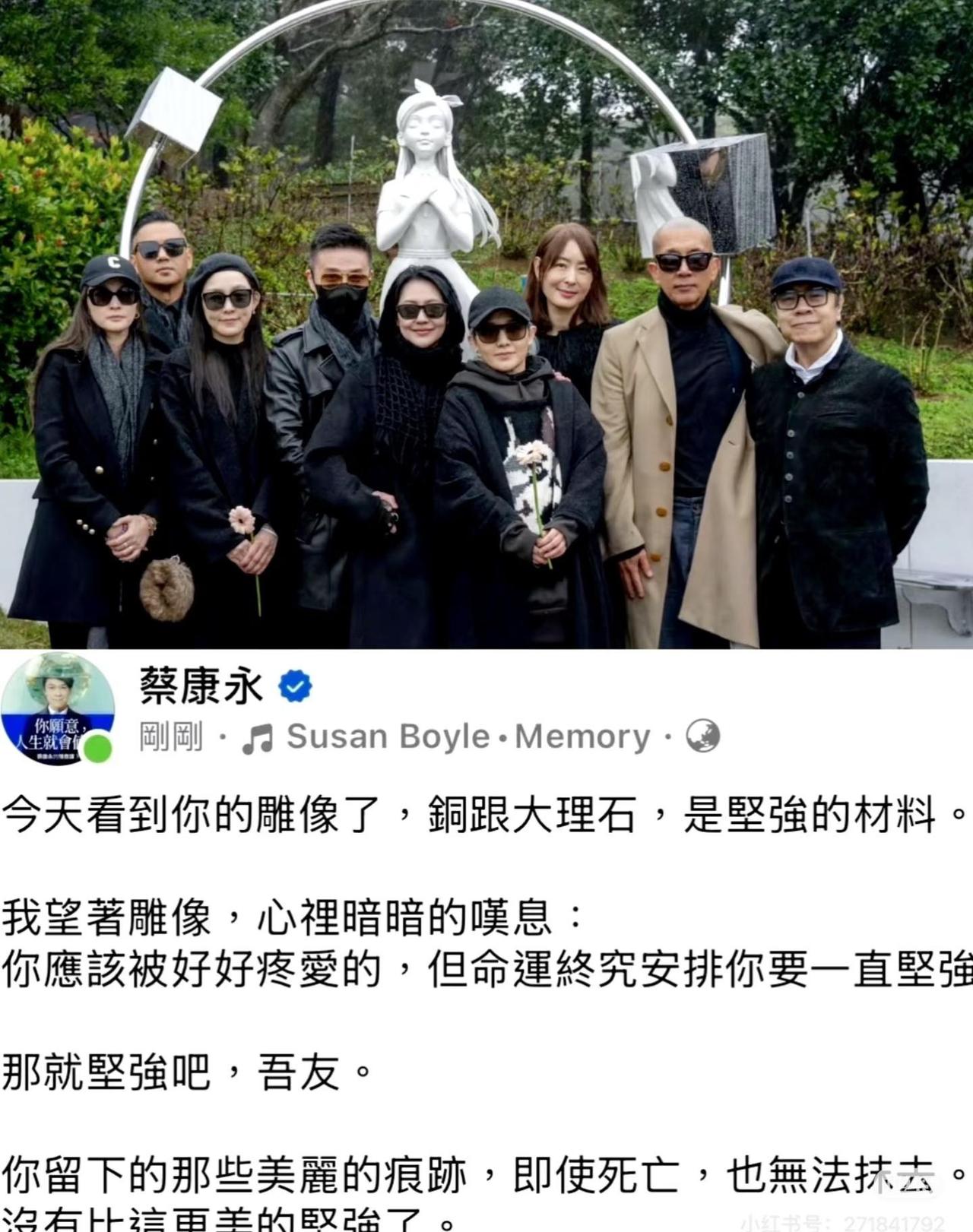 大S 我从来不算是大S的粉丝,所有她的消息都是当娱乐新闻来看待。直到她的消逝,很震惊和遗憾,这样的一个人儿,创造了这么多的话题,制造了这么多的影响,这么年轻就走了。仅此而已。但是,今天她的雕塑揭幕,这么多的亲人好友还能来看她,发自肺腑的想念她,第一次让我对她的逝去有了伤感。然而,至今仍有这么多的挚友为她惋惜,也是一件很幸运的事了。就算在天堂看到这些,应该也会开心吧。