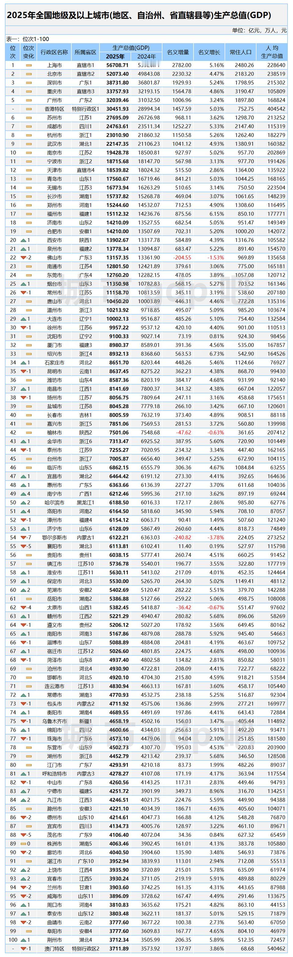 2025年GDP百强城市出炉:佛山跌出20强、宁德上升7名、周口泰安超曲靖 截止