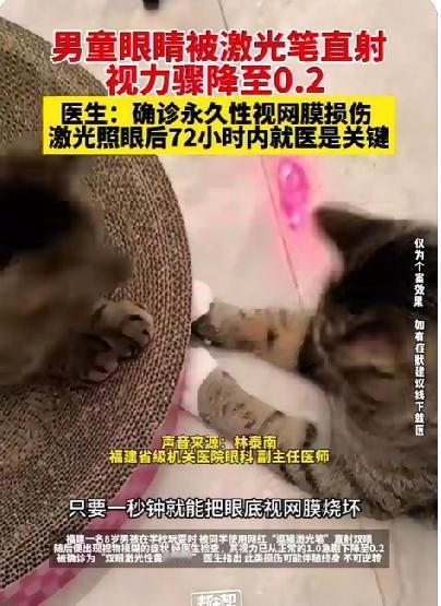 小小激光笔对眼睛伤害竟这么大!8岁男童被激光笔直射双眼 视力骤降致永久性损伤 近日,福建惠安8岁男童兵兵(化名)因被激光笔直射双眼,视力从正常的1.0骤降至0.2,经泉州市妇幼保健院检查,确诊为双眼激光性黄斑损伤,视网膜感光细胞层出现中断与缺失,属于永久性视网膜损伤。 据了解,兵兵是在与同学玩耍时,被对方手中的网红“逗猫激光笔”直射双眼,仅短短几秒的照射,便引发了严重的视力问题。起初兵兵并未明显察觉不适,直到学校体检时,家人才发现其视力异常,就医时眼部已出现中央遮挡感、视物模糊等症状 。万幸的是,兵兵就医及时,暂未出现眼底新生血管,经过一个半月的抗炎、眼底营养支持等治疗,视力恢复至0.7,但医生明确表示,其视网膜的结构性损伤已无法逆转,可能伴随终身 。 医生特别提醒,激光照眼后72小时内是救治黄金窗口期,一旦出现视物模糊、眼前黑影、眼痛等症状,需立即前往眼科专科就诊,切勿自行判断或拖延 。儿童眼部组织稚嫩,瞳孔更大,接收的激光能量比成人多30%-50%,且视网膜自我修复能力弱,是激光损伤的高危人群,即便无明显不适,被激光照射后也必须及时检查。 一支小小的激光笔,竟成为伤害儿童视力的“凶器”,作为家长的我们,要有这方面的安全意识,同时商家也应该提醒购买者。之前网友就有报道小孩子不小心误食玩具中的矿物油而导致白肺,身体健康严重受损。这些事件都提醒着我们:安全无小事,警惕“小玩具”背后的大风险。另外我们家长给孩子买玩具时也应该谨慎筛选,对于这种有潜在危险的玩具要坚决说“不”!