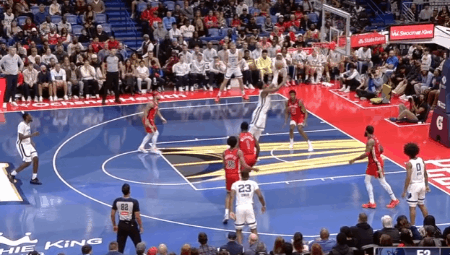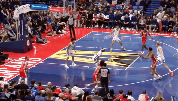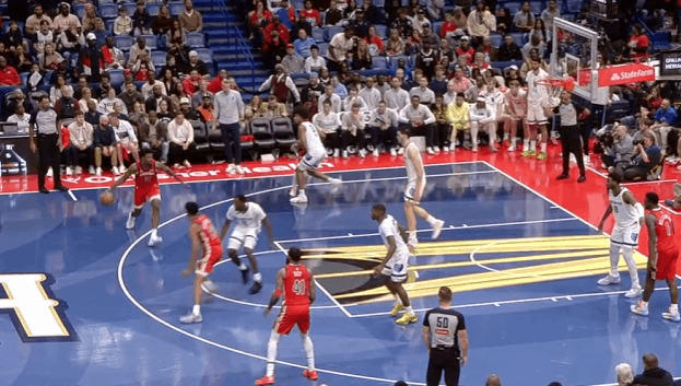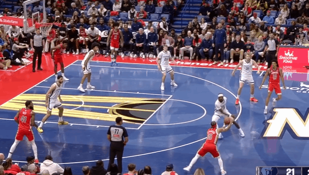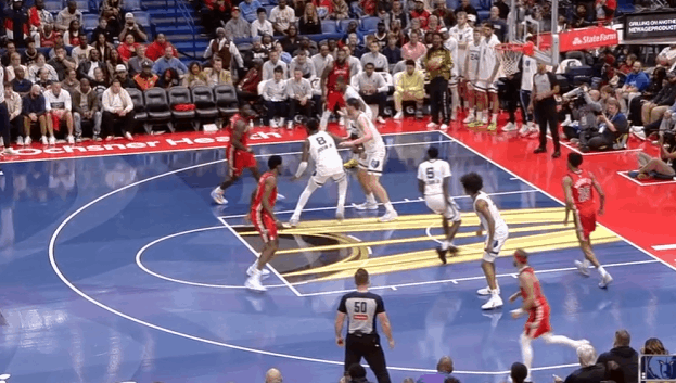 P4锡安腰位背身接球后见协防的阿尔达马不断上前、蠢蠢欲动,立即回传给强侧接应的老六,老六接球垫步调整后三分空心入网。