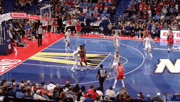 P7锡安强侧持球突破吸引防守注意力,老六趁威尔斯走神+米西无球掩护上提至45°获得出手空档,接锡安传球三分稳稳命中。