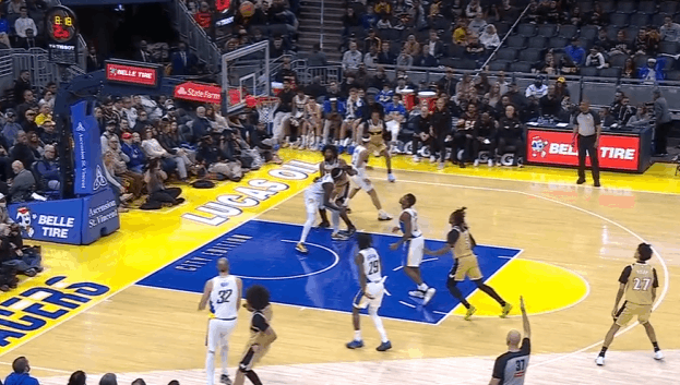 P7莱利远距离高抛投不中,巴格利篮下牢牢将杰克逊卡住身后,随后在篮下连续起跳点抢一抢二将球补进篮筐。