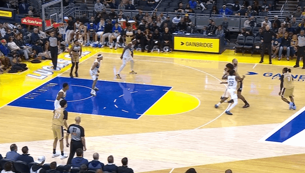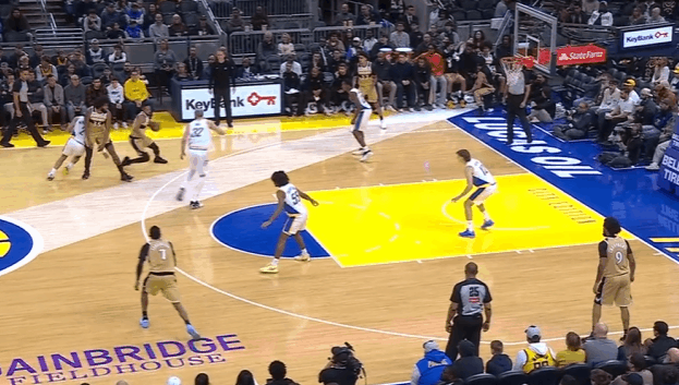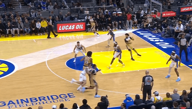 P5卡灵顿弧顶操刀挡拆吸引胡夫延误,巴格利Slip快拆切入篮下获得空位终结机会。篮下接卡灵顿高吊传球,落地双手大力炸球调整后迅速起身背扣隔扣胡夫。