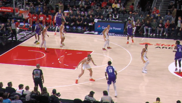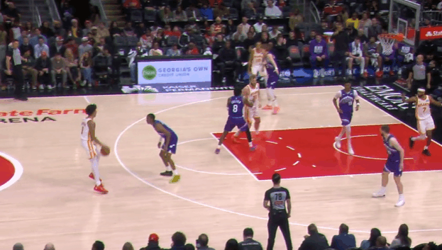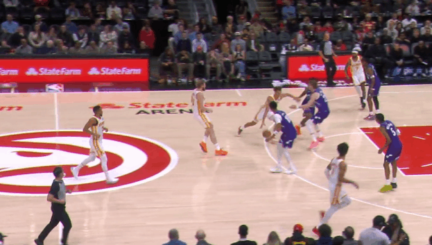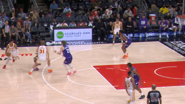 P6戴森抓早期进攻直接推球变向启动突破搅乱防守阵型,随即回传给外线空位的兰代尔,兰代尔接球大空位三分稳稳命中。