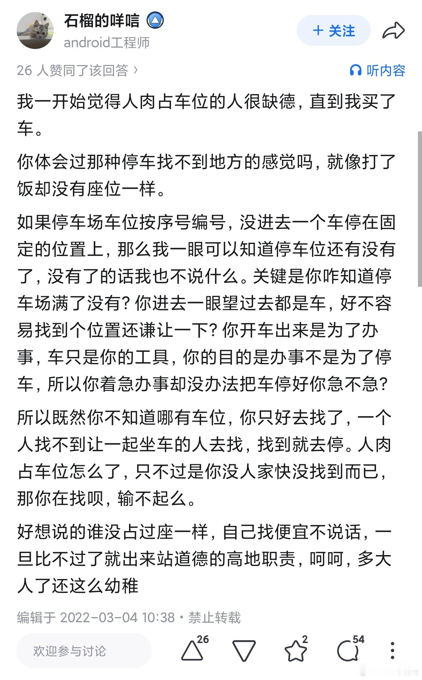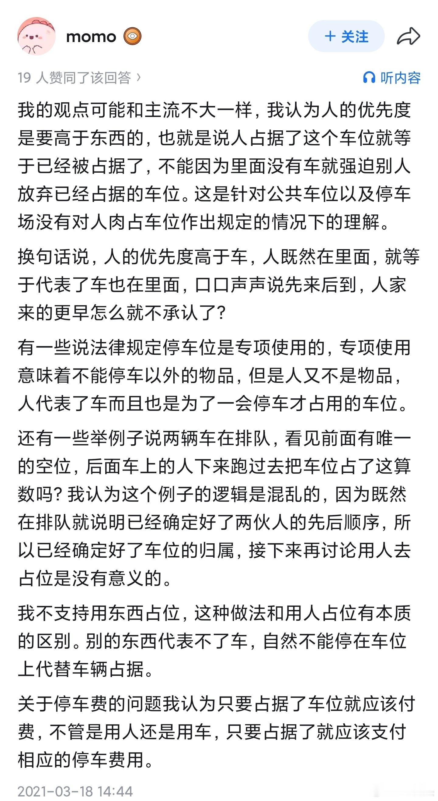 刷到一个“人肉占车位”发生冲突的视频,很好奇人肉占车位到底有没有支持者,然后就去知乎搜了一下,看到点赞最多的几个答案竟然都是支持者…