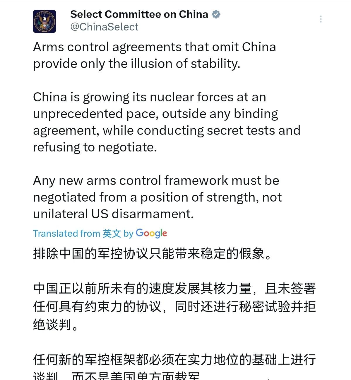 美国众议院中国问题委员会将矛头对准我们!2月7日,该委员会声称,将中国排除在外的军控协议,带来的不过是虚假的稳定。中国在不受“任何具约束力协议”约束的情况下,正以“前所未有”的速度扩充核力量,同时开展秘密试验、拒绝相关谈判。任何新的军控框架,都必须以实力为基础展开谈判,而非让美国单方面裁军。 他们公然声称,将中国排除在外的军控协议,带来的不过是虚假的稳定。这番话看似冠冕堂皇,实则藏着不可告人的算计。 该委员会还污蔑中国,说中国在不受“任何具约束力协议”约束的情况下,正以“前所未有”的速度扩充核力量。他们甚至造谣,说中国在秘密开展核试验,还故意拒绝相关军控谈判。 最后,他们还倒打一耙,放话说任何新的军控框架,都必须以实力为基础展开谈判,而非让美国单方面裁军。 明眼人一看就知道,美国方面的心思昭然若揭。他们就是想给中国扣上“不负责”的帽子,逼着中国加入所谓的核军控谈判,变相限制中国的国防力量发展。 可我看着他们这副贼喊捉贼的模样,心里只剩愤怒和可笑。该委员会的这些说辞,无疑是荒谬透顶,完全是颠倒是非、混淆黑白,根本站不住脚。 全球权威核力量研究机构斯德哥尔摩国际和平研究所,公布的2025年数据最有说服力。全球总共只有12241枚核弹头,美俄两国加起来就占了90%以上。 其中美国拥有5177枚核弹头,俄罗斯拥有5459枚核弹头,两国妥妥的“核霸双雄”,手里握着足以毁灭地球好几次的核力量。 再看中国,核弹头数量只有600枚,连美国的八分之一都不到,甚至不如美俄任意一国的零头。这样悬殊的差距,明摆着不是一个量级。 可就是这样两个拥有全球九成以上核武器的国家,不主动站出来削减核力量,反而盯着中国这点用于自卫的核力量,要求中国加入“对等”约束。 这不是荒唐透顶是什么?就好比一个手握百把尖刀的壮汉,逼着手里只有一把水果刀的人放下武器,一起接受“平等”管制,简直是蛮不讲理到了极点。 所谓的中国不受“任何具约束力协议”约束、疯狂扩充核力量,更是无稽之谈,纯粹是美国编造的谎言,用来污蔑中国的借口。 中国一直是国际军控规则的坚定维护者和执行者,早就签署并严格遵守《不扩散核武器条约》《全面禁止核试验条约》等一系列国际军控规则。 自1996年以来,中国就主动恪守暂停核试验的承诺,从未开展过任何秘密核试验,这一点,全球有目共睹,绝非美国一句谎言就能抹黑。 反观美国,才是真正不受约束、肆意破坏国际军控规则的始作俑者。2019年,美国单方面宣布退出《中导条约》,无视国际社会的反对,公然撕毁自己签署的协议。 就在2月5日,美俄之间唯一的军控条约《新削减战略武器条约》正式到期失效。俄罗斯早在2025年9月就提议,将条约核心限制措施自愿延长一年,可美国始终没有给出正式答复。 美国嘴上喊着军控谈判,背地里却在疯狂扩充核力量、研发新型核武器。2026财年,美国的国防预算直接冲到1.01万亿美元,光是武器研发就砸了1790亿美元。 他们一边推进B-21战略轰炸机的部署,一边忙着量产B61-13新型核弹。这款核弹的当量高达36万吨TNT,是当年广岛原子弹的24倍,命中精度比普通家庭的客厅还要小。 美国这哪里是想军控,分明是想打造更具杀伤力的核力量,维持自己的霸权地位,这种双重标准,简直让人不齿。 中国愿意为国际军控事业作出贡献,但这种贡献,必须建立在平等、公正、合理的基础上,必须遵循“核裁军应遵循循序渐进、均衡削减的原则”。 要谈核军控,首先应该由美俄两国带头大幅削减核力量,这才是负责任的表现,而不是本末倒置,盯着中国这点用于自卫的核力量说三道四。 美国众议院中国问题委员会的这番闹剧,终究会被现实狠狠打脸。他们的谎言,终究会被全世界人民看穿。 中国的发展,从来不会因为别人的污蔑和遏制就停下脚步。中国会一如既往地坚持自己的核政策,坚定维护自身的安全利益,也会继续为维护全球核安全、促进国际军控事业发展作出自己的贡献。 那些妄图靠谎言污蔑中国、靠霸权遏制中国的势力,最终只会搬起石头砸自己的脚,只会被时代的潮流所淘汰。