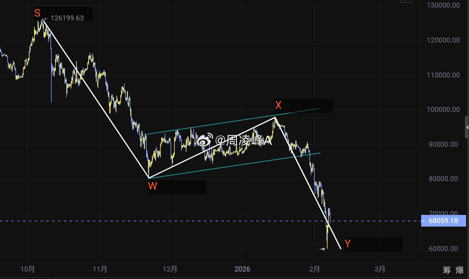 比特币呈现WXY下跌结构,当前处于Y浪下跌阶段,该浪下跌目标区间为50000-60000美元