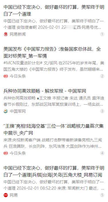 下定决心,做好最坏的打算?美军终于明白中国准备的不是一场战争,而是一整套战争体系。 麻烦看官老爷们右上角点击一下“关注”,既方便您进行讨论和分享,又能给您带来不一样的参与感,感谢您的支持! 2025 年 12 月 23 日,五角大楼发布最新一期中国军力报告,这份报告彻底抛开了往年单纯罗列装备数字的傲慢姿态,用大篇幅内容承认了解放军的作战体系建设成果,明确指出解放军以 “多域精确战” 为核心,在西太平洋构建起牢固的反介入作战防线。 这份报告里,美军首次清晰认可了解放军核、海、空、火箭军等多领域力量的联动能力,直言解放军的火力打击范围已实现对第一、第二岛链的全面覆盖,不再是单一军种的局部威慑,而是多军种协同的全域作战能力。 其实在这份报告发布前,美军内部就已开展过多轮高保真兵棋推演,推演数据精准到基地跑道修复时限、油库储备天数、指挥节点冗余配置等具体细节,而非以往的宏观概念模拟,结果让美军高层倍感震撼。 推演得出的结论十分残酷,一旦在西太平洋爆发高强度冲突,美军部署在第一岛链内的航母、前沿空军基地、关键指挥枢纽等高价值目标,生存时间将按小时计算,远超出美军此前的心理预期。 更让美军忌惮的是,其长期依赖的作战链条存在明显短板,只要预警机、数据链枢纽等关键环节被精准摧毁,整个作战体系就会出现连锁崩溃,美军也首次真切体会到被解放军战争体系全面碾压的滋味。 美军终于看清,解放军多年来的准备,从来不是为了打某一场具体的战争,而是打造了一套以非对称制衡、全域联动为核心的完整战争体系,这套体系让解放军拥有了应对各类外部威胁的综合作战能力。 在核力量层面,解放军已经形成成熟的陆海空基 “三位一体” 战略核布局,陆基洲际导弹、海基潜射导弹、空基远程导弹相互配合,不仅实现了全球范围的打击覆盖,更拥有了可靠的二次核打击能力,核威慑力大幅提升。 常规作战领域,解放军打造出层层递进的梯次火力网,从近程火箭炮到中远程弹道导弹,从舰载反舰武器到空基精确打击装备,各型武器装备在一体化指挥信息系统的调度下,实现了无死角的协同打击。 如今的一体化指挥信息系统,早已打通了解放军各军种的信息壁垒,从情报获取、目标识别到火力打击、效果评估,整个流程效率大幅提升,各作战单元能实现自主协同、实时协同,作战响应速度显著加快。 在太空、网络这些新兴作战领域,解放军也完成了深度布局,反卫星、网络攻防等技术已形成实战能力,各类察打一体无人机、无人作战舰艇等无人平台的广泛应用,更是让解放军的作战威慑力再上一个台阶。 解放军这套战争体系的强大,并非单纯依靠装备的堆砌,其根本原因在于中国拥有完备的工业体系,从装备研发、生产到维护保障,都能实现自主可控,关键核心技术不再受制于人,为体系运转提供了坚实支撑。 更重要的是,中国的军民融合发展模式,能在战时迅速将民用资源转化为军事用途,从物流、交通基础设施到数据、工业产能,都能为战争体系提供全方位保障,让这套体系拥有了持久的作战支撑能力。 面对解放军成型的战争体系,美军的战略部署开始出现明显调整,2026 年初,美军太平洋舰队正式取消了在台海周边的常态化 “航行自由行动”,这一举措背后,是美军对自身在西太平洋作战优势的重新评估。 美军的战略退缩,也直接影响到其盟友体系,日本、澳大利亚等原本紧跟美国步伐的国家,在涉华军事态度上相继出现松动,不再轻易做出激进的军事表态,其盟友体系因忌惮解放军的战争体系开始出现裂痕。 美军的转变,本质上是对自身实力和解放军发展的重新认知,从以往的傲慢轻视,到如今的正视忌惮,背后是解放军多年来埋头发展的必然结果。中国打造战争体系,从来不是为了主动挑起战争,而是为了做好最坏的打算,以强大的实力捍卫国家主权和领土完整。 在复杂的国际局势下,只有自身实力足够强大,才能掌握战略主动权,解放军的战争体系,就是中国应对外部风险的底气所在,也是维护地区和平与稳定的重要力量,任何试图挑战中国核心利益的行为,都将面临这套体系的强力反制。