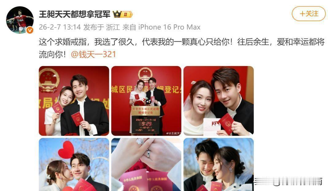 乒乓球亚洲杯激烈进行中,国乒、国羽一对恋人600天地下恋情结成正果,金日公开宣示喜结连理!国羽男双主力王昶,国乒美女钱天一撒糖啦!26年2月7日13:14时,同时晒出结婚证! 王昶发的照片里戒指金光闪闪,配文真诚甜蜜:“这颗真心只给你! 往后余生,爱和幸运都流向你! ”,钱天一配文幸福满满:“生日愿望是嫁给你, 睁眼就实现了”。 国羽男双王昶 国乒第一美女钱天一 国乒小花钱天一 国羽第一帅 王昶乒乓球赛照 国羽CP