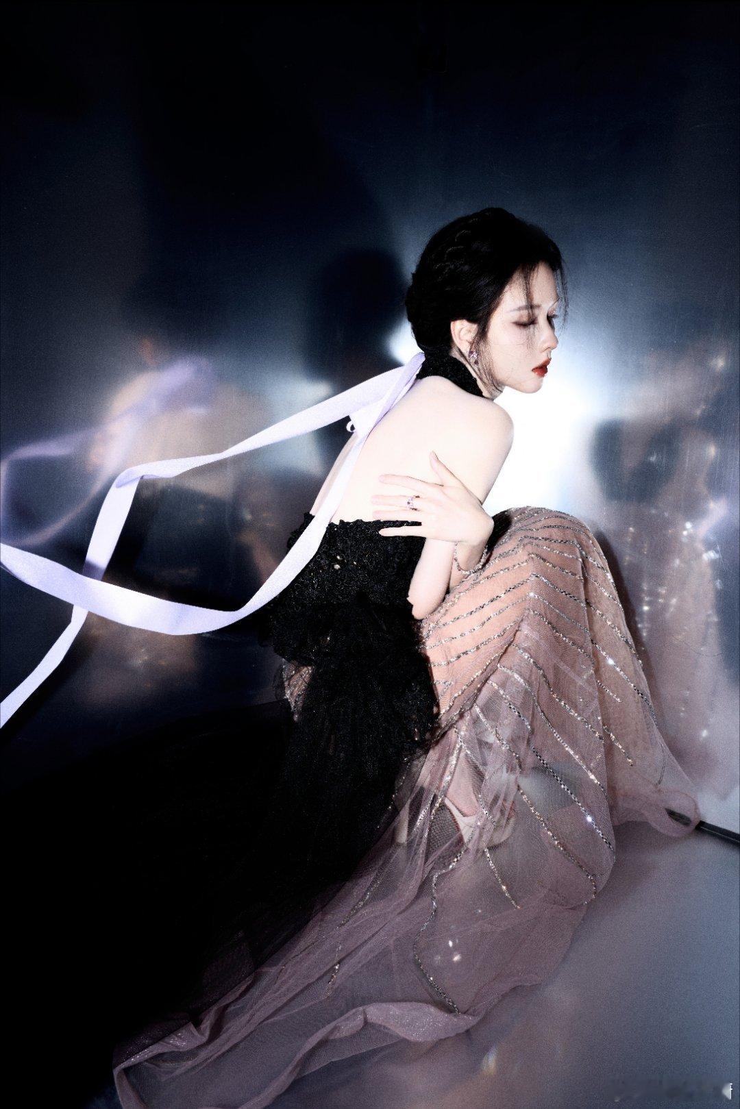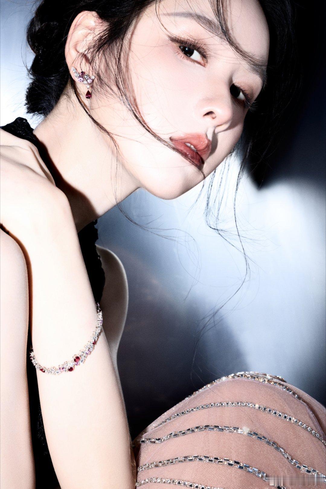 陈都灵珠光辉映凝脂肩,丝带轻旋若蝶跹。暗夜鎏金织成裙,流光与心事共缠绵。顶奢珠宝认领陈都灵