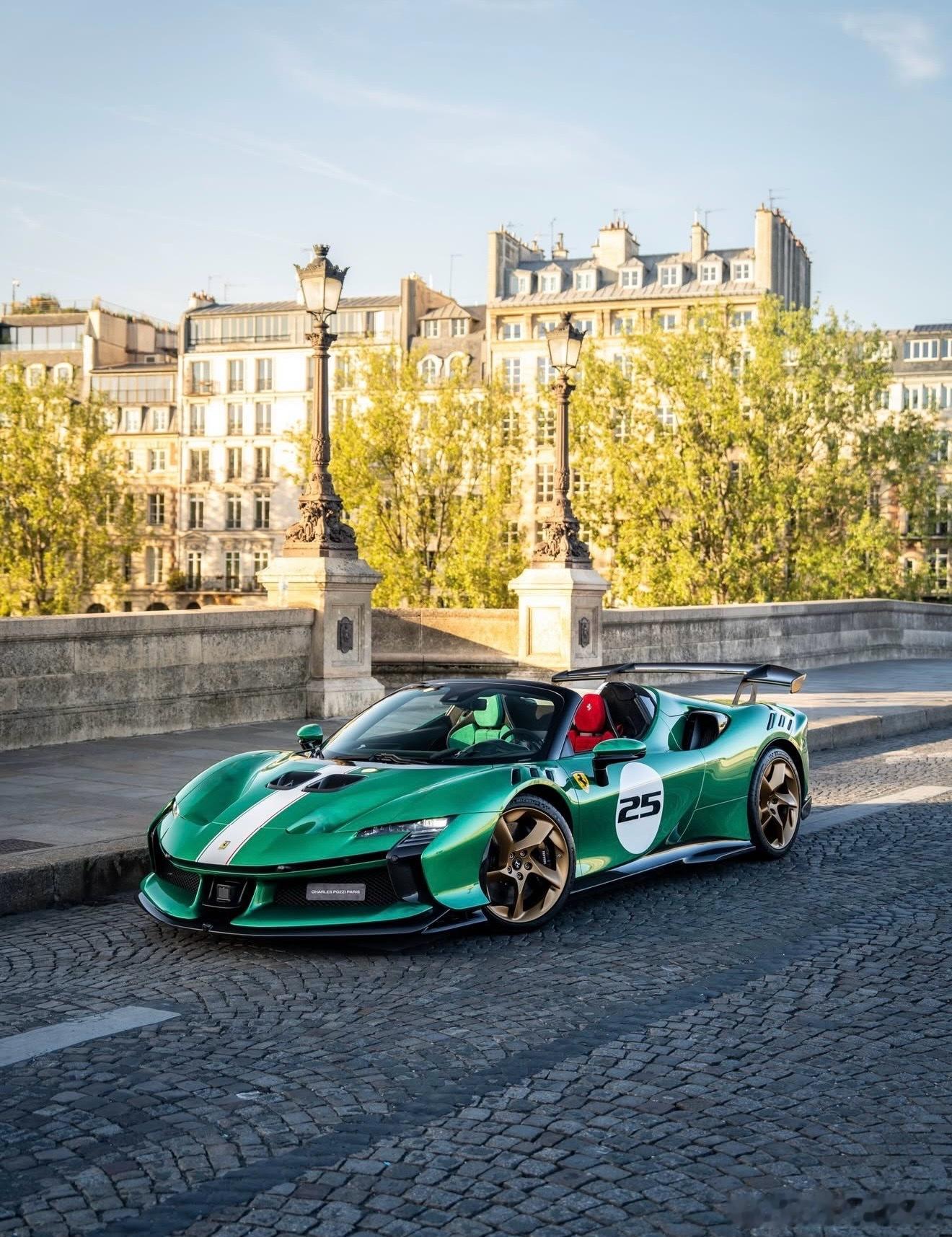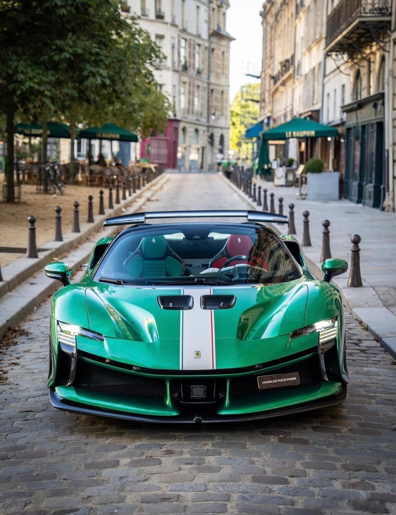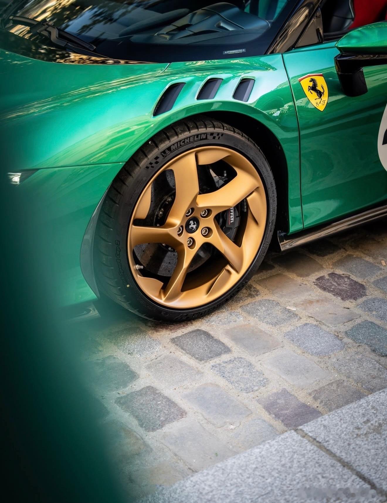这个SF90 XX的涂装是我认为的绿宝石色,配备了金色轮毂、黑色刹车卡钳、喷漆的护板、三色中心条纹,以及黑色内饰,座椅为红绿相间的Alcantara材质。你对这个配置有什么看法?