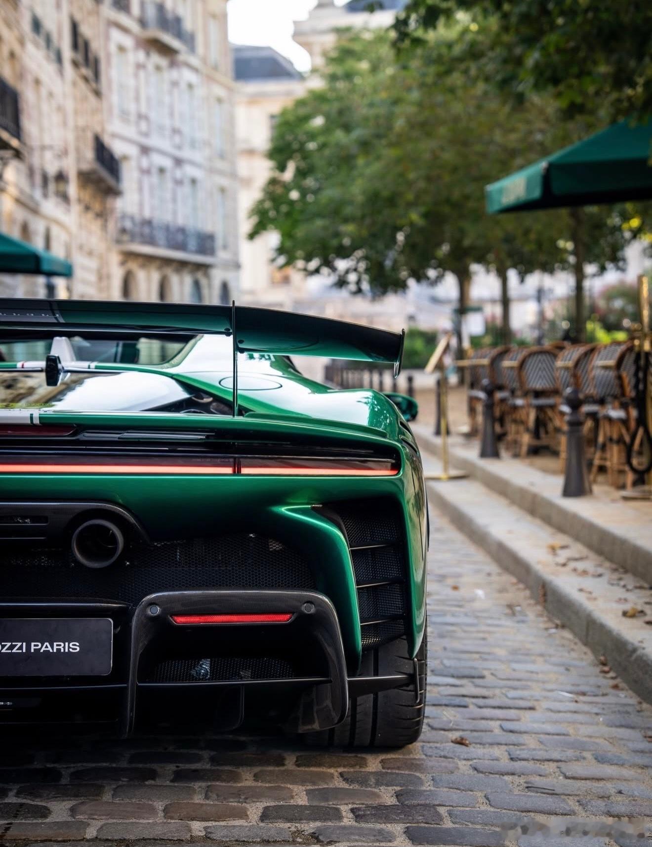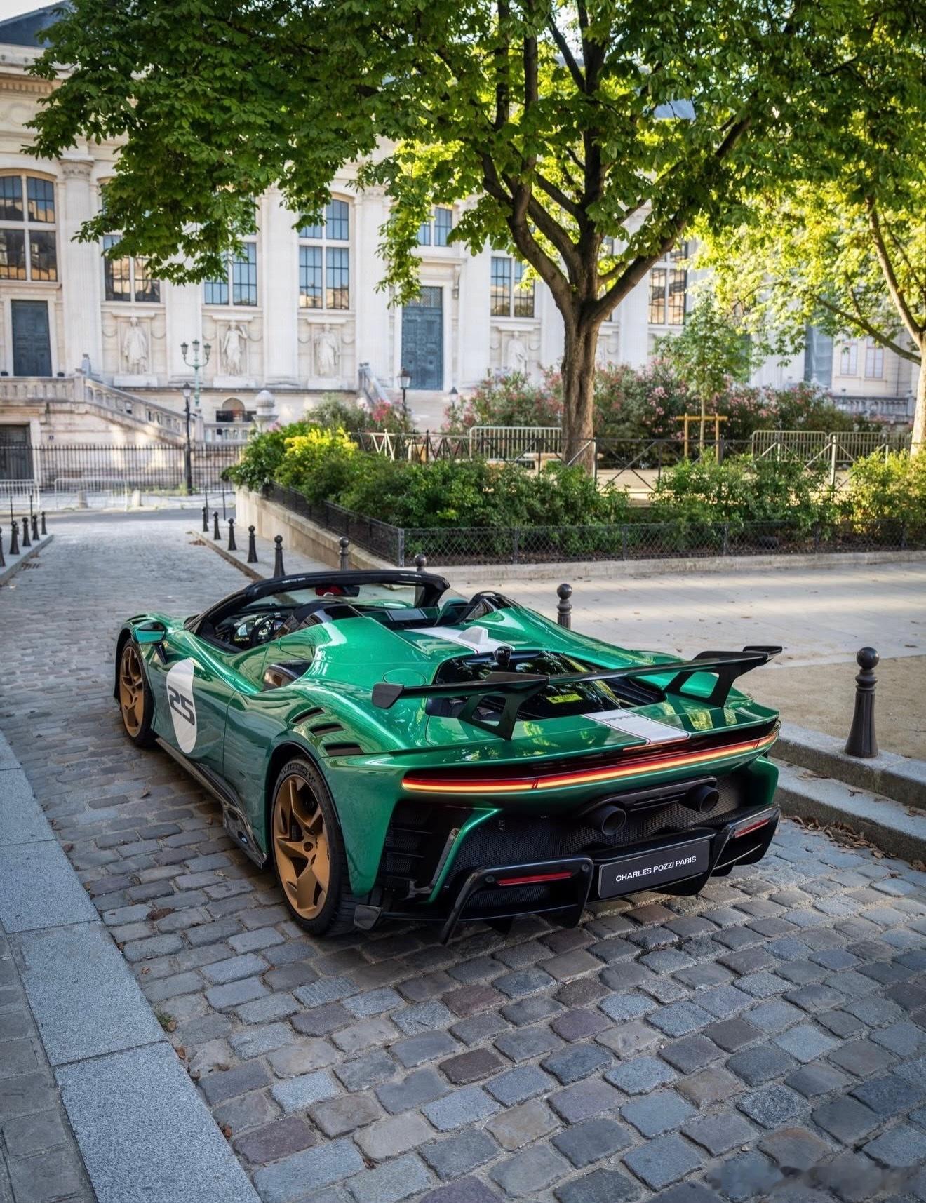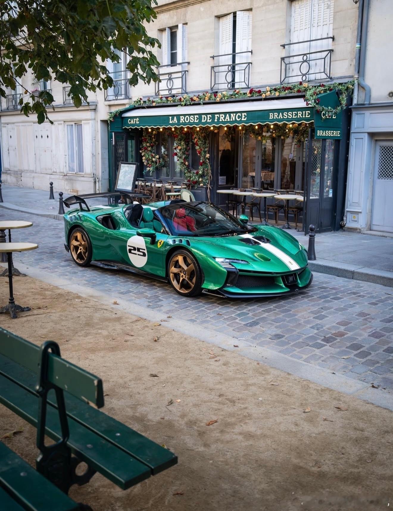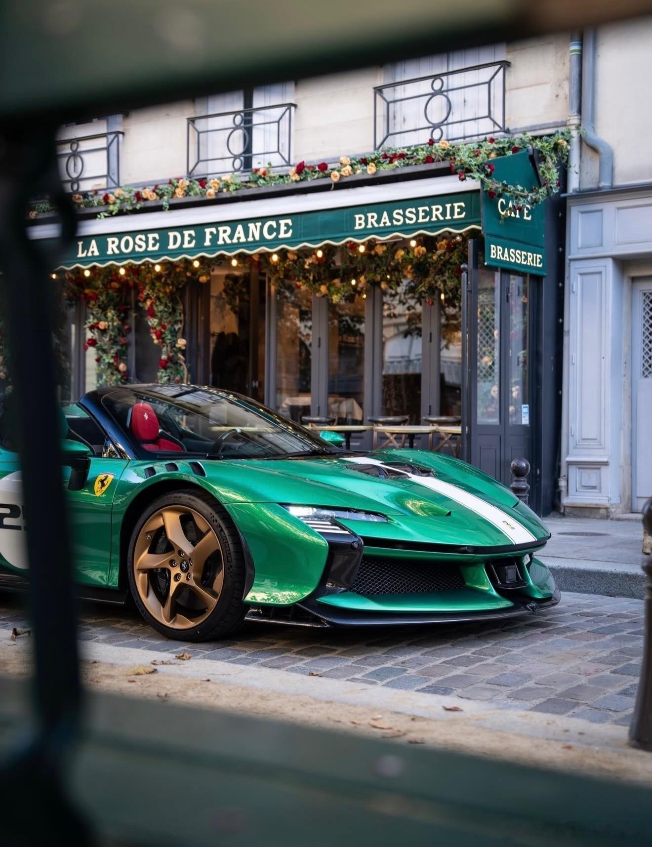 这个SF90 XX的涂装是我认为的绿宝石色,配备了金色轮毂、黑色刹车卡钳、喷漆的护板、三色中心条纹,以及黑色内饰,座椅为红绿相间的Alcantara材质。你对这个配置有什么看法?