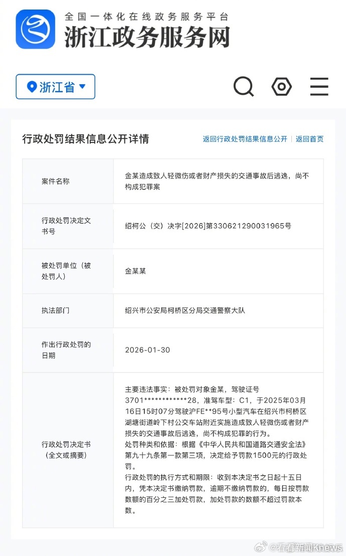 【#金晨肇事逃逸被罚款1500元# 】#金晨肇事逃逸尚不构成犯罪#2月7日,浙江政务服务网公开金晨交通肇事逃逸事件处罚结果,称金晨驾驶小型汽车在绍兴市柯桥区湖塘街道岭下村公交站附近实施造成致人轻微伤或者财产损失的交通事故后逃逸的行为,尚不构成犯罪,决定给予罚款1500元的行政处罚。