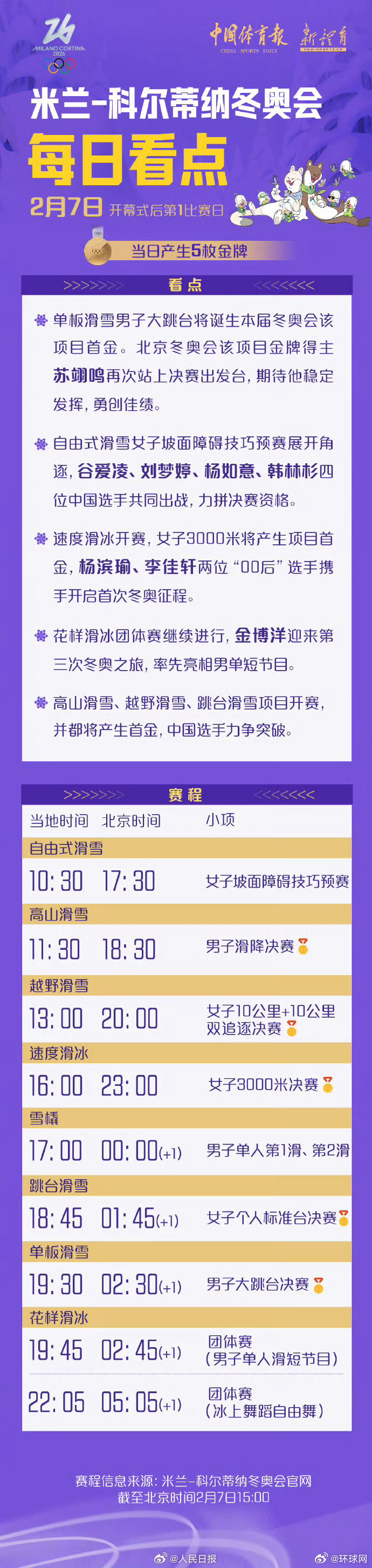 【转发加油!米兰冬奥每日看点】米兰冬奥会7日看点↓↓#苏翊鸣出战大跳台决赛##谷爱凌本届冬奥会首秀#单板滑雪男子大跳台,再次站上决赛出发台,期待他稳定发挥,勇创佳绩自由式滑雪女子坡面障碍技巧,谷爱凌、 、杨如意、韩林杉四位中国选手共同出战预赛,力拼决赛资格速度滑冰开赛,女子3000米将产生项目首金,、李佳轩两位“00后”选手携手出战花样滑冰团体赛继续进行,出战男单短节目高山滑雪、越野滑雪、跳台滑雪都将产生首金,中国选手力争突破(中国体育报)