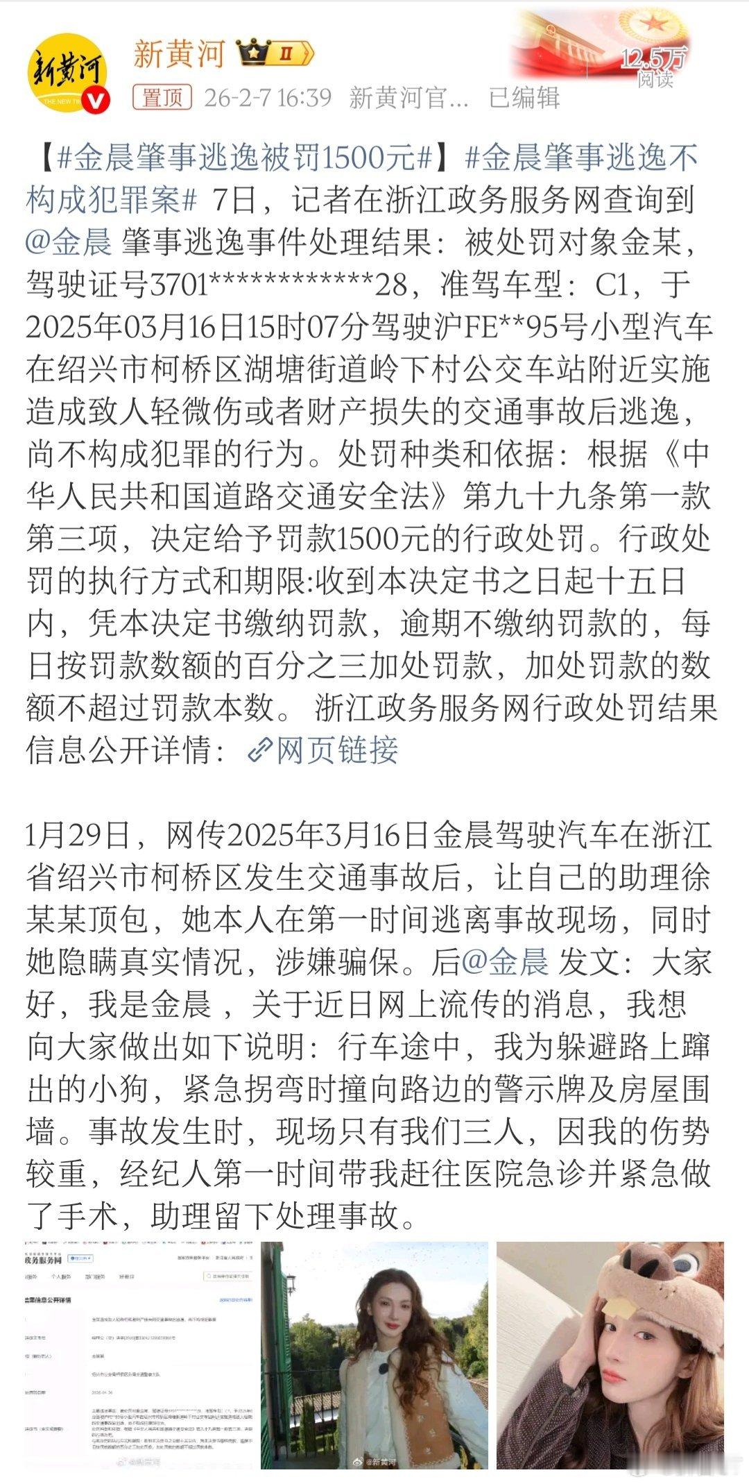 【#金晨交通事故处罚结果公开#】#金晨肇事逃逸被罚款1500元#近日,“金晨涉
