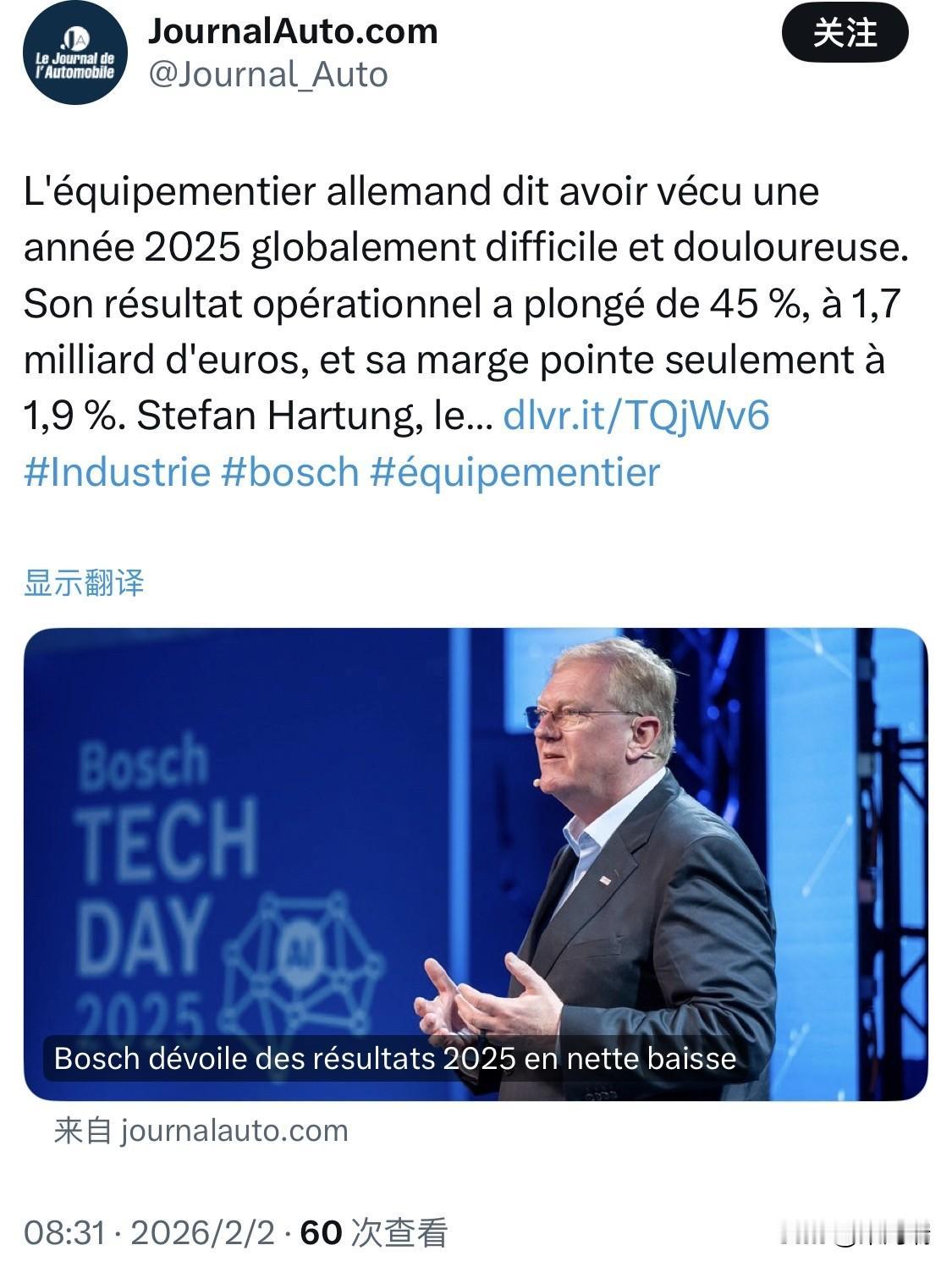 根据博世(Robert Bosch GmbH)于 2026年1月30日 发布的初步财务业绩,公司正面临严峻的利润压力并计划大规模裁员: 利润近乎腰斩:博世 2025 财年的营运息税前利润(EBIT)从 2024 年的 3.5% 下滑至约 2%。由于 2024 年的营运利润本身已较 2023 年(48亿欧元)下降了约三分之一至 31-32亿欧元,2025 年的进一步下滑标志着其利润率处于极低水平。 裁员 2 万人计划:博世已确认计划裁减约 20,000 个工作岗位,以应对德国工业衰退及全球汽车市场的挑战。 构成细分:该裁员计划由多个阶段累积而成,包括 2024 年宣布的 9,000 人及 2025 年追加的 13,000 人(主要针对德国境内的汽车零部件业务)。 赔偿成本:公司已预留了约 27亿欧元 的资金用于支付裁员相关的遣散费和重组费用。 中国市场动向:在中国,博世近期被曝已启动针对燃油汽车和氢燃料电池项目的裁员,涉及人数约 200 人,并提供 N+4 的优厚补偿方案。虽然博世中国官方称此为“正常经营优化”,但承认在新兴领域(如辅助驾驶、电控等)盈利状况不乐观。 原因分析:首席执行官史蒂凡·哈通(Stefan Hartung)将 2025 年描述为“痛苦的一年”,主要归因于燃油车业务萎缩、向电动化转型成本高昂、能源成本上升以及来自特斯拉、比亚迪等企业的激烈竞争。
