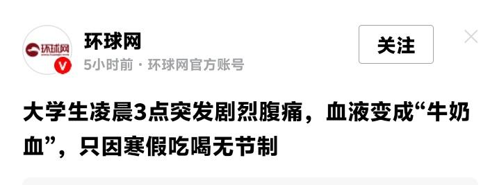 惊魂武汉!大学生寒假放纵狂欢,凌晨腹痛险丧命,体内抽出“牛奶血”震惊医护,背后真相警醒亿万年轻人 当同龄人还沉浸在寒假睡到自然醒的甜蜜中,武汉一名大学生却因深夜剧痛,躺进了重症监护室的病床。抽出的血液不是鲜红,而是浑浊的乳白色,像掺了牛奶。这骇人一幕,就真实发生在武汉市普仁医院。一场关于放纵的代价,正在敲响警钟。 谁都想过年回家吃好喝好,可凡事总有代价。这名学生放假后彻底放飞,火锅、烧烤、奶茶、甜点来者不拒,把身体当成了无底洞。欲望满足的瞬间,即是偿还的开始。凌晨三点,剧痛袭来,他原以为只是寻常肠胃不适,却不知死神已悄然逼近。 赶到医院时,检查结果让医生都倒吸一口凉气。甘油三酯数值爆表,超出正常值四十七倍。血液静置后,竟分层成乳白色的油脂和淡黄血清。那不是科幻镜头,而是他体内流动的“危险信号”。高血脂已不是数字,而是肉眼可见的生命威胁。 病情急转直下,高热、剧痛、血压飙升,他很快被推进重症监护室。血液滤过时,滤出的油脂废物让见多识广的医护都感到震惊。那不只是代谢废物,更是日常放纵堆积的“债”。每一口无节制的狂欢,都在为这场危机添砖加瓦。 主治医生罗刚后怕地表示,急性重症胰腺炎病死率极高,若再延误,后果不堪设想。好在抢救及时,学生已转回普通病房。但这场生死劫,注定在他青春里刻下深深一笔。健康从来不是年轻人的资本,而是最易挥霍的财富。 武汉市普仁医院肝胆胰疝外科主任杜杰沉重提醒,这类病例近年并不少见。节假日成高发期,年轻患者占比上升。背后折射的,是放纵的饮食文化、缺失的健康管理,与侥幸心理的泛滥。我们总以为疾病很远,直到它突然敲门。 说到底,身体是最诚实的记录者。你如何对待它,它便如何回馈你。这场“牛奶血”风波,不该只是他人的新闻。它更像一面镜子,照见每个人日常的选择。是及时克制,还是继续挥霍?答案,就在你每一餐的取舍之间。 健康没有侥幸,生命无法重来。别等躺上病床,才想起平凡的珍贵。从今天起,敬畏身体,克制欲望,才是对自己最大的负责。愿你我,皆能远离“牛奶血”的惊魂,拥抱清醒而长久的人生。 (来源:极目新闻、FM93交通之声、武汉市普仁医院病例实录) 健康警示 大学生健康