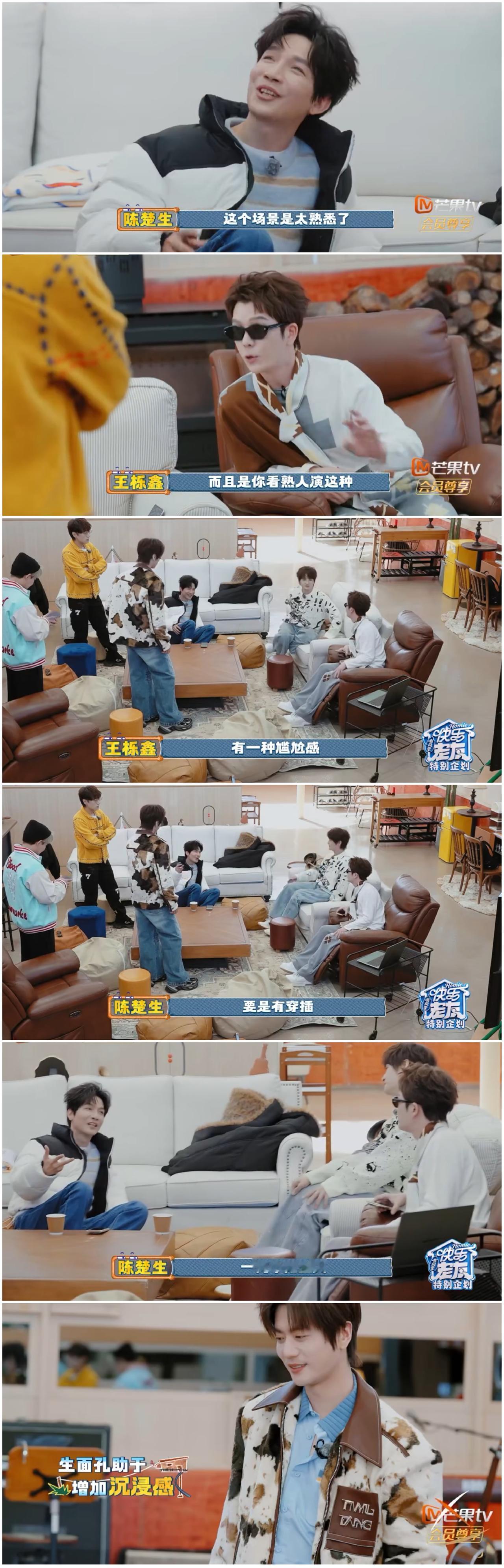 陈楚生太全面了, 就这样一针见血, 兄弟们都信服了。 陈楚生由于工作原因缺席短剧拍摄。 陈楚生看完兄弟们的短剧成片后, 他强调王铮亮很适合反派。 在网友眼中王铮亮总是给人 温柔与温文尔雅的感觉。 但是陈楚生发现王铮亮有 冷峻与凌厉的一面, 只要王铮亮站在那里, 一个眼神, 那个角色就立住了。 陈楚生强调兄弟们的短剧整体上不错, 但是他觉得可除了他们5兄弟外, 如果可以穿插一下其他人, 会更加让他们沉浸去演绎。 另外他们是在厚米乐园取景演戏, 都是熟悉的场景, 有时会出戏, 有一种尴尬感。 熟悉的人, 熟悉的地方, 不利于兄弟们沉浸其中。 陈楚生建议他们在新场景 新加入一两个陌生人, 短剧出来的效果可能更加好。 哎呀, 就综艺节目里的一个短剧, 为了节约成本, 导演没有预算请其他人, 没有预算租场地, 就只能凑合着用了。 哎呀, 陈楚生那么有想法, 其实可以自己制作或者导演 一部短剧, 说不定很受欢迎。 如果这次他们短剧反响不错, 他们兄弟6人 可以考虑一起好好拍 一部短剧试试哦。