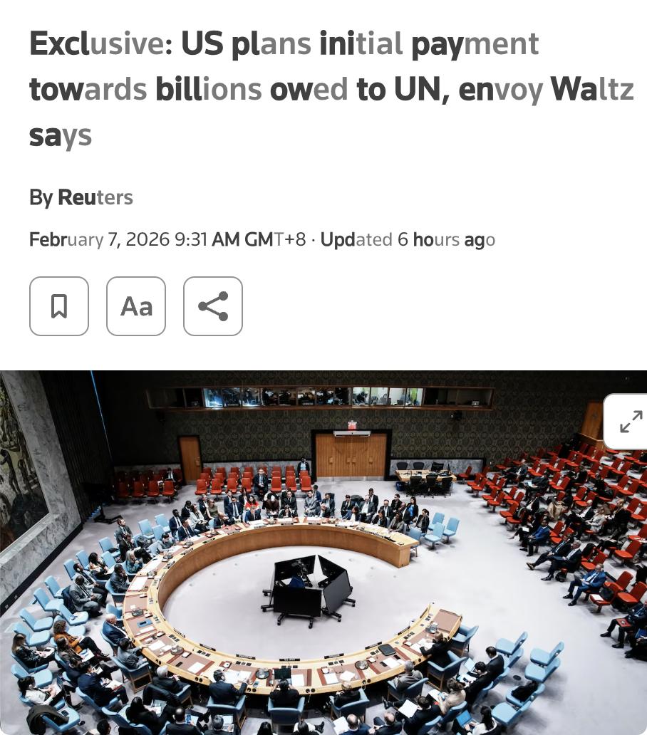 外媒:美国计划在未来几周内向联合国支付首批款项,以偿还其欠下的数十亿美元债务。 美国驻联合国大使迈克·沃尔茨在电话采访中表示,首批付款将是美国年度会费的“重要首付”,但最终金额尚未确定。 联合国秘书长古特雷斯此前警告称,由于美国欠款,联合国面临“迫在眉睫的财政崩溃”风险。美国欠联合国常规预算超过21.9亿美元,还欠24亿美元用于维和任务以及4360万美元用于联合国法庭。 沃尔茨强调,联合国需要继续推进改革,美国支持古特雷斯的UN80改革计划,但认为改革还不够深入。