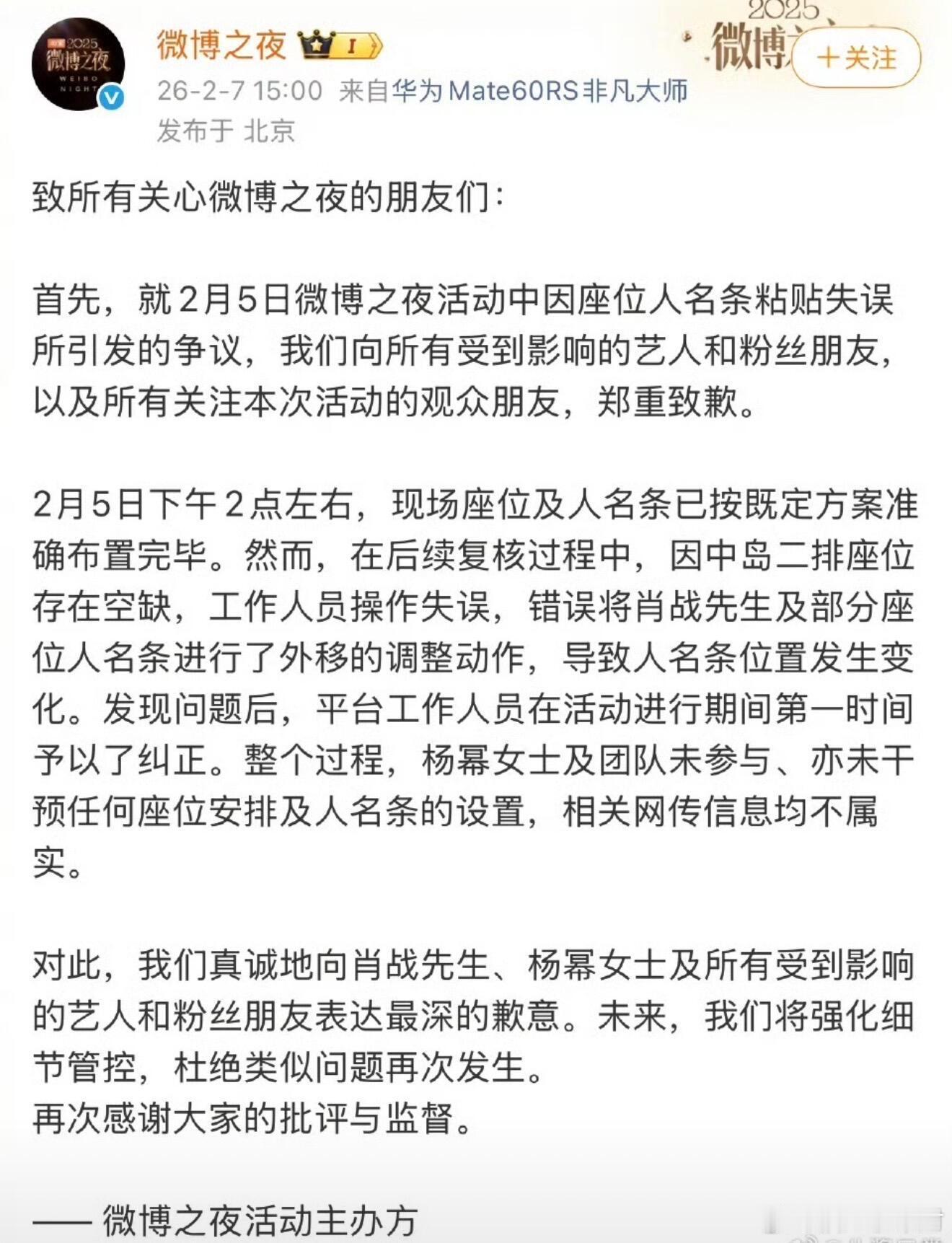 微博之夜主办方发了关于那天座位事件的说明,并向肖战、杨幂及所有受到影响的艺人和粉