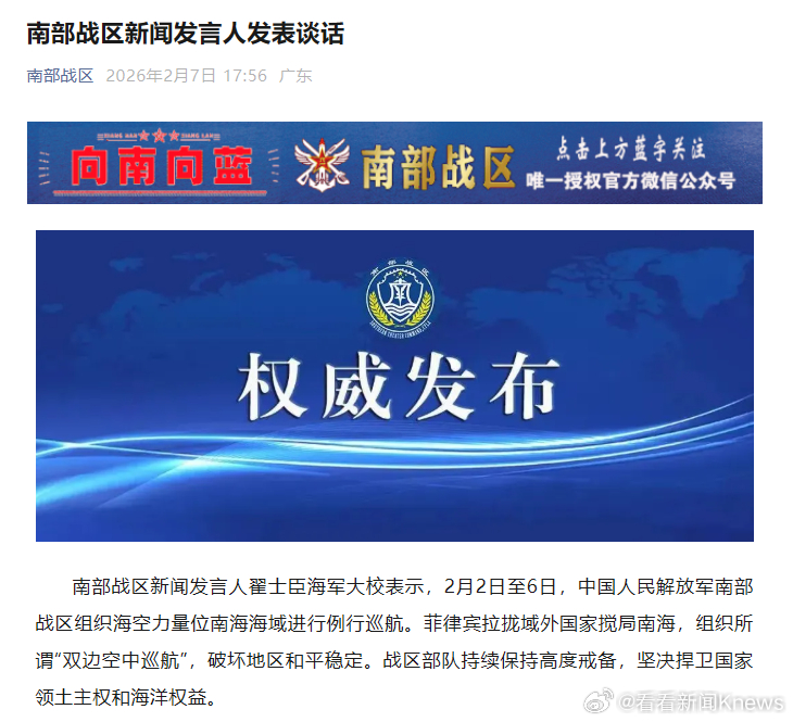 【#南部战区新闻发言人发表谈话#】南部战区新闻发言人翟士臣海军大校表示,2月2日至6日,中国人民解放军南部战区组织海空力量位南海海域进行例行巡航。菲律宾拉拢域外国家搅局南海,组织所谓“双边空中巡航”,破坏地区和平稳定。战区部队持续保持高度戒备,坚决捍卫国家领土主权和海洋权益。