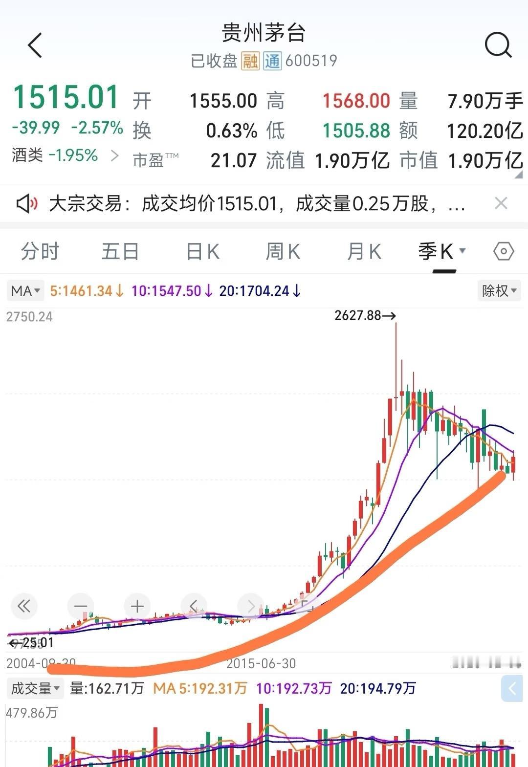案例:我们的茅台这样上涨就好了 我们的大茅台业绩也是年年上涨, 可惜前几年股价被投机过度打的太高了, 现在茅台不贵,希望以后慢慢走, 用业绩慢慢推升股价, 千万别大幅拉估值上涨, 要不然又是几年不涨消化高估。 公司当前的利润和资产就是股价的锚, 不管股价高估低估多么严重, 长期看都将回归估值中枢, 只有不断长大的公司才能有不断上涨的股价。