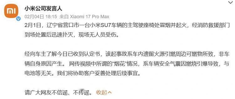 小米回应营口起火!汽车着火,虽然说是偶发事件,但它的影响力却非同一般,可以说让一个发展势头正猛的企业停滞不前。企业要发展,必须正面回应相关问题,并且找出问题所在,给出相应的解决办法。 事件发生以后,小米汽车积极对接,结合有关部门调查,及时公告,给出问题产生原因,好在没有人员伤亡,这也是不幸中的万幸。 作为一个民族企业,一定要把汽车安全放在首位,把客户的安全放在心上。解决发展之路上的所有问题,才能有更好的发展。