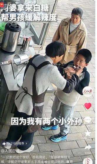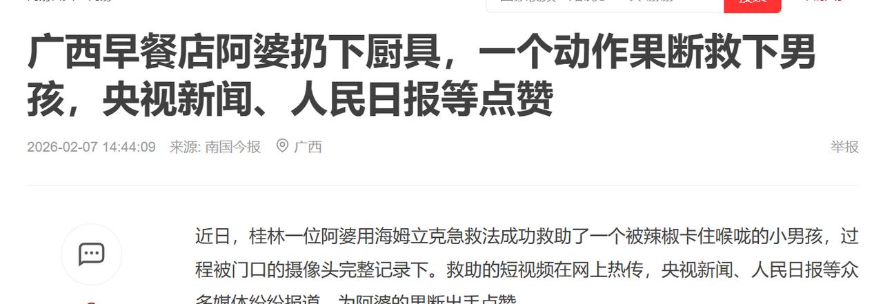 “这个阿婆火到央视了!”近日,广西一位阿婆正在卖早餐,突然一男子走了过来,表情痛苦的说了句:“我呛到了!”阿婆赶紧问:“是呛到了还是卡到了?”谁知,男孩刚说了“卡”就说不出话了,阿婆立马过去用海姆立克急救法成功救回孩子! 男孩缓过劲来,立马咳嗽了几声,脸上的痛苦神色慢慢褪去。他扶着自己的喉咙,眼神里满是后怕,对着阿婆连连道谢。 阿婆没顾上擦手上的油污,又转身拿起摊位上的白糖,舀了一勺递给男孩。阿婆轻声叮嘱男孩,让他含着白糖缓一缓,说是能减轻喉咙里的辣意。原来男孩刚才吃了辣椒,一不小心就卡进了气道,才出现了窒息的险情。 这一幕被阿婆早餐摊门口的摄像头完整拍了下来。视频里,阿婆的动作干脆利落,没有一丝犹豫。她扔下手中的厨具,几步就冲到男孩身后,双手紧紧抱住男孩的腰部,一手握拳,将拳眼对准男孩脐上两横指的位置,另一手牢牢包住拳头,用力向内向上冲击,几下之后,男孩就恢复了正常。 这段短视频很快就在网上传开了。网友们看了之后,纷纷给阿婆点赞留言,有人说阿婆太勇敢了,有人说阿婆手速太快,还有人说这才是最动人的平凡英雄。 央视新闻特意转发了这段救人视频,还配文称赞阿婆,说她用一个果断的举动,挽回了一个孩子的生命,也温暖了全网。 后来大家才知道,阿婆姓钟,是广西桂林荔浦市人,今年六十多岁,在当地摆早餐摊卖馄饨已经有些年头了。 钟阿婆在接受采访时,说得特别朴实。钟阿婆还说,当时看到男孩痛苦的样子,她根本没多想,脑子里就一个念头,那就是赶紧救人。钟阿婆觉得,这都是举手之劳,换做任何人,看到孩子有危险,都会伸出援手。 现在网上有很多人传言,说海姆立克急救法改了,不能再用原来的方法了。这里必须跟大家说清楚,这其实是对新指南的误解。海姆立克急救法并没有被推翻,也没有被替代,只是气道异物梗阻的急救流程做了优化。 旧版指南对成年人和1岁以上儿童,优先推荐单纯的腹部冲击。2025年的新指南,优化成了“先拍背、后冲击”的交替流程,也就是先拍5次背,再做5次冲击,循环往复,直到异物排出。 钟阿婆当时用的是传统的腹部冲击法,没有先拍背,但一样救了人。这是因为,不管是旧流程还是新流程,核心的急救逻辑没有变,海姆立克急救法的核心手法也没有变。最关键的不是纠结于流程的先后,而是敢出手、找对位置、用对力度。 异物卡喉的危险,远比我们想象的要大。据了解,窒息导致的死亡,大多发生在窒息后的4到6分钟内,这就是急救的黄金时间。很多时候,急救人员根本来不及赶到现场,这时候,身边人的急救能力,就成了挽救生命的唯一希望。 反观我们身边,很多人都没有急救意识,也根本不懂任何急救方法。平时刷到急救知识,要么匆匆划过,要么觉得“用不上”,从来不会认真去记、去学。 还有一些人,就算知道一些急救方法,看到有人遇到危险,也会犹豫观望,担心自己救不好,担心惹上麻烦。就是这一瞬间的犹豫,可能就会错过最佳的急救时间,酿成无法挽回的悲剧。 钟阿婆的事迹,之所以能火遍全网,之所以能被央视报道,不仅仅是因为她救了一个孩子,更因为她的举动,给我们所有人上了生动的一课。它告诉我们,急救知识从来都不是“无用的知识”,它是能在关键时刻救命的技能。 善良从来都不需要惊天动地的壮举,不需要豪言壮语,只需要在关键时刻,放下顾虑,伸出援手。钟阿婆只是一个普通的早餐摊主,没有高深的文化,没有显赫的身份,但她用自己的行动,诠释了什么是平凡中的伟大。 现在很多人,总觉得“多一事不如少一事”,面对别人的困难,习惯了冷漠和观望。可钟阿婆用实际行动证明,这个世界上,还是温暖居多,还是善良居多。 另外还要提醒大家,就算异物成功排出,也不能掉以轻心。不管患者当时感觉多好,都应该及时去医院做检查,排除残留异物和内脏损伤的可能。钟阿婆事后喂男孩白糖缓解不适,这个举动也特别贴心,既照顾到了男孩的感受,也避免了二次伤害。 钟阿婆火了之后,很多网友都表示,要去桂林荔浦,吃一碗钟阿婆包的馄饨,向她表示感谢。还有很多人,因为钟阿婆的事迹,开始主动去学习海姆立克急救法,开始重视急救知识的普及。 这大概就是钟阿婆事迹的意义所在。它不仅挽救了一个孩子的生命,更唤醒了很多人的急救意识和善良之心。它让我们明白,每个人都可以成为拯救生命的英雄,只要我们愿意多学一点急救知识,多一份勇气和善良。 最后,希望大家都能记住钟阿婆的样子,记住这个平凡又伟大的早餐摊主。也希望大家都能主动去学习急救知识,把这份救命的技能记在心里,传下去。说不定哪天,我们也能像钟阿婆一样,用自己的举手之劳,挽救一个生命,温暖一个家庭。 信息来源:央视新闻