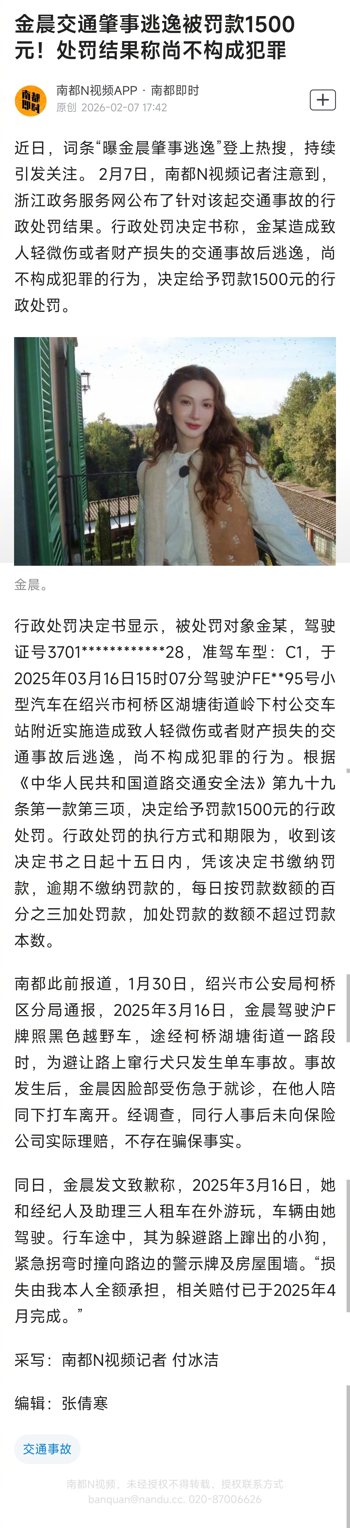 #金晨肇事逃逸罚款1500元#【金晨交通肇事逃逸被罚款1500元!处罚结果称尚不构成犯罪】#警方认定金晨肇事逃逸不构成犯罪#近日,词条“曝金晨肇事逃逸”登上热搜,持续引发关注。 2月7日,南都N视频记者注意到,浙江政务服务网公布了针对该起交通事故的行政处罚结果。行政处罚决定书称,金某造成致人轻微伤或者财产损失的交通事故后逃逸,尚不构成犯罪的行为,决定给予罚款1500元的行政处罚。网页链接