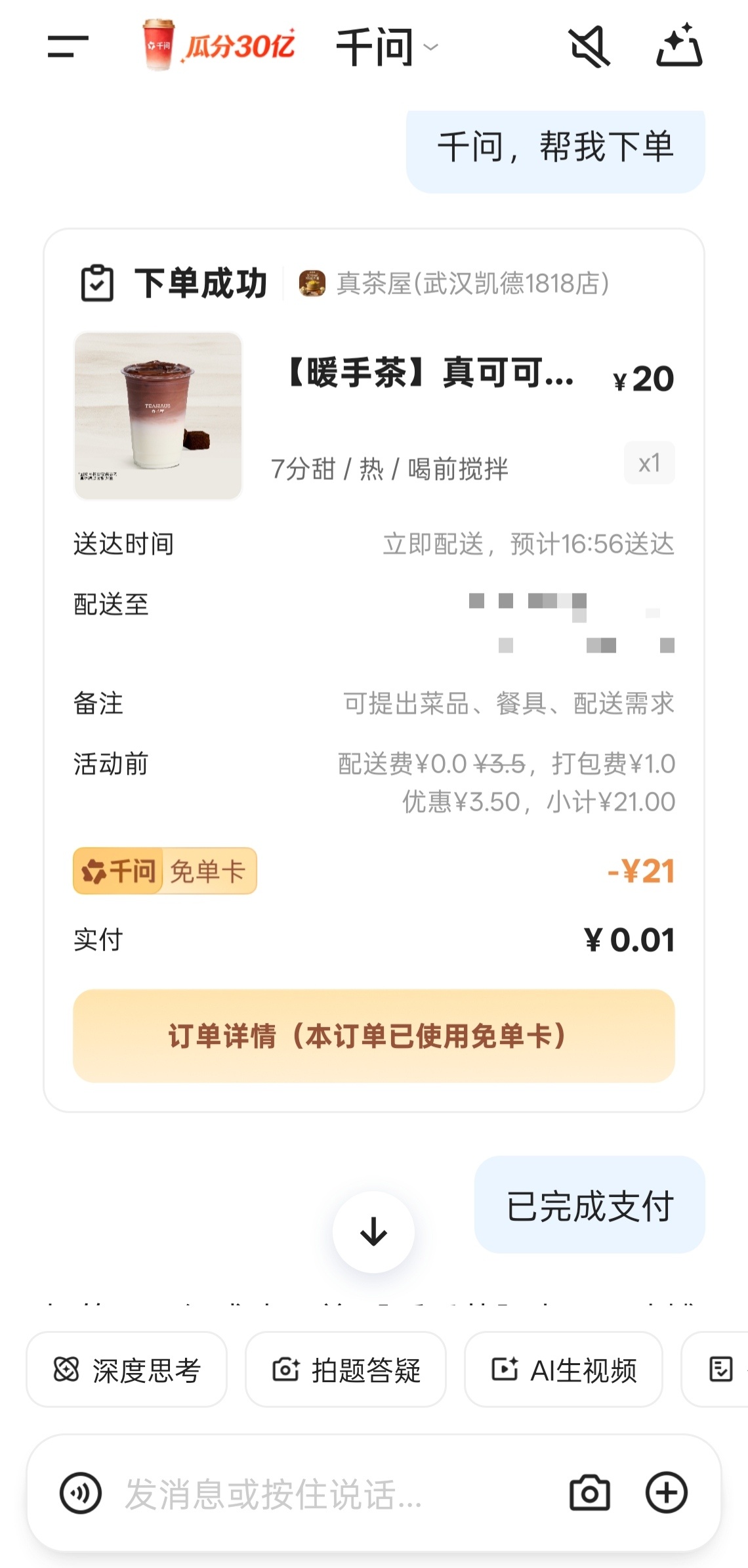 千问小伙伴刷了一天终于把奶茶点上了现在好像没那么拥挤了,大家可以多试几次