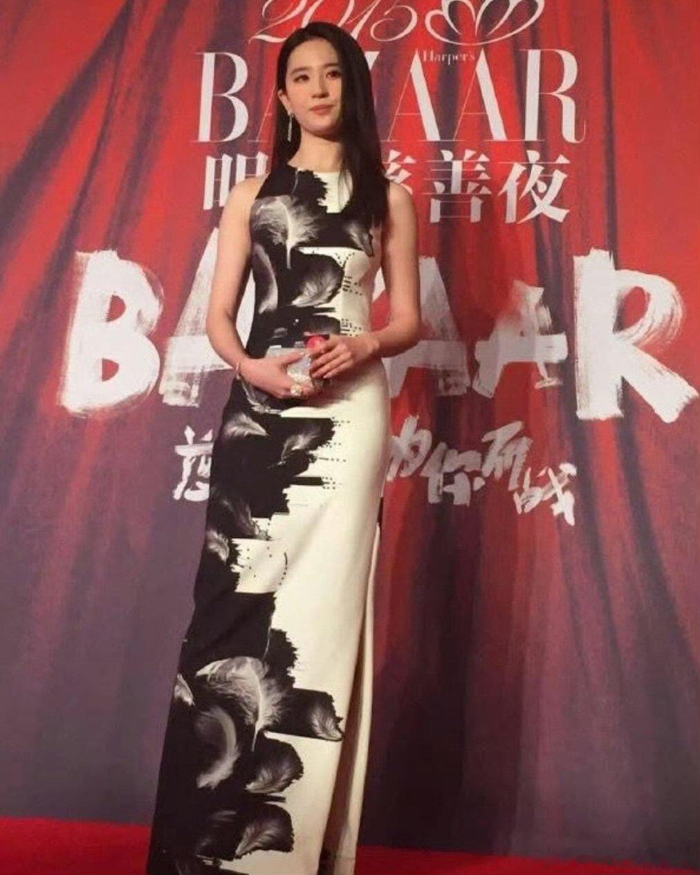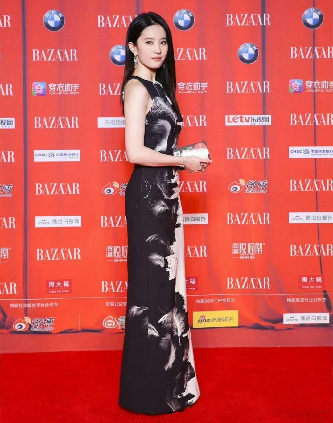 刘亦菲此次亮相芭莎慈善夜,身着一袭水墨印花长裙,黑白配色自带中式写意的雅致韵味,仿佛一幅流动的国画在裙身上铺展开来。