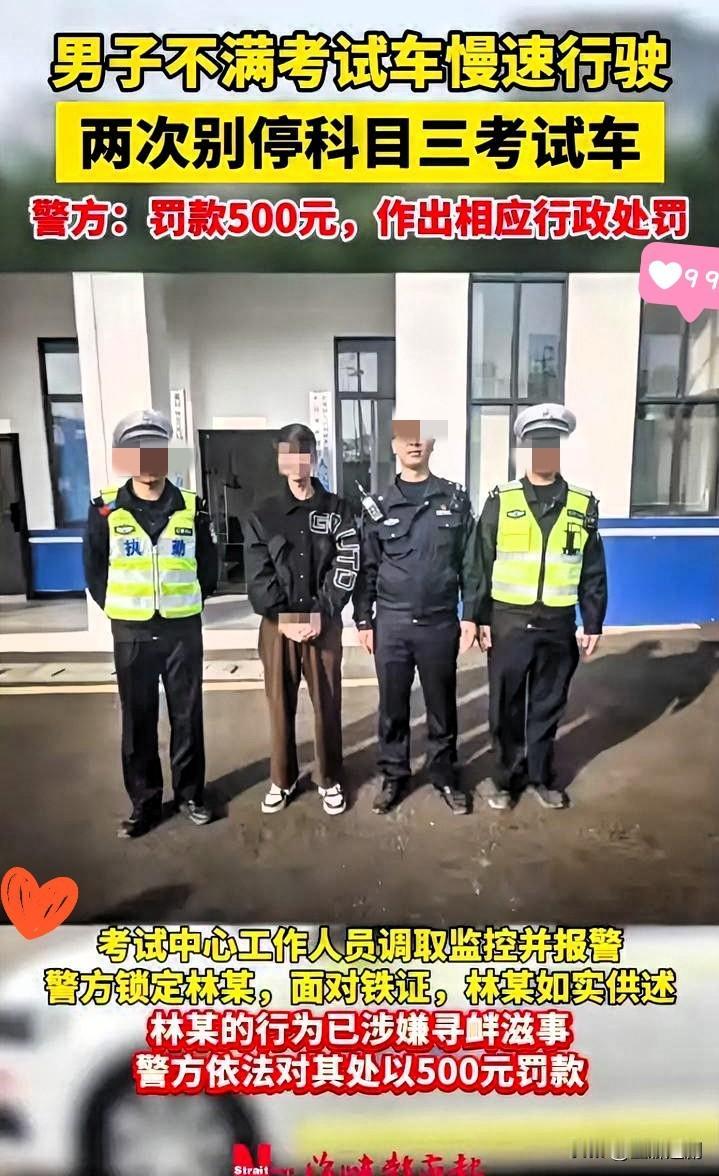 有些人天生就是坏,男子嫌科目三考试车开得慢,两次恶意别停致考生挂科,考试中心调取监控后报警,最终该男子被罚款500还遭行政处分,这波处罚真是大快人心! 科目三考试本就有速度规范,考生按规行驶没半点错,这位司机却因一己私愤,不顾道路安全恶意别车,不仅毁了别人的考试成果,更扰乱了正常交通秩序,这种路怒式的任性,绝不能纵容! 开车上路本就该互相包容,考试路段本就需要格外礼让,凭什么让别人为你的坏脾气买单?法律的处罚不仅是给涉事司机的教训,更是给所有路怒症敲警钟:道路不是撒气场,一时冲动的违法操作,终究要付出代价。 唯有守住规则、管住脾气,才能让道路更安全。你觉得对这类恶意别车的行为,处罚力度还该再加码吗?