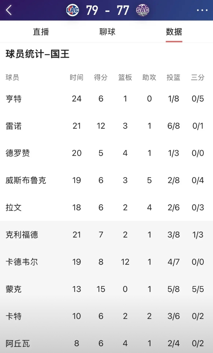 国王真是一支奇葩球队,今天面对快船,首发中四人三节打得不如替补,亨特8中1,德罗赞3中1,威少8中2,卡文6中2,完全依靠替补与快船紧咬比分,蒙克表现明显好于首发4人,但是仍然一直打替补,摆明了是要摆烂。 而快船今天替补前三节总共拿到13分,原本以为本赛季快船要逆袭,结果交易后,跟摆烂队国王打得有来有回,今天这场如果输球的话,将会再次跌至西部第十,这赛季的快船大概率没啥希望了。