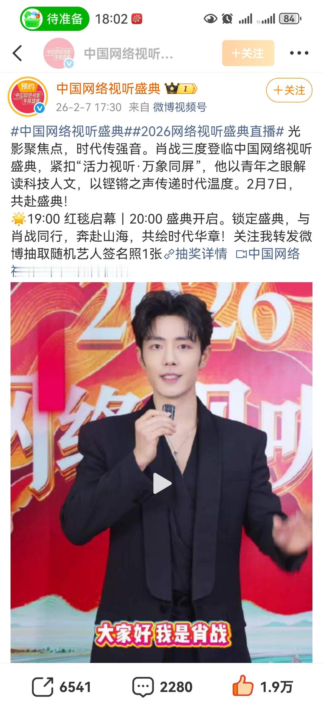 中国网络视听盛典今晚七点开始红毯,八点开始盛典,肖战是全篇主讲人,记得收看哟[比心][比心][比心]