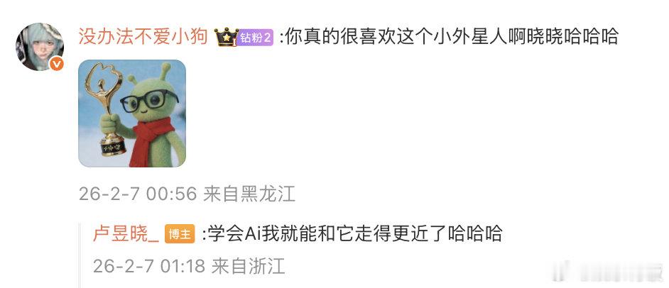 卢昱晓在内场不敢拿起手机卢昱晓为了表情包学会AI做图 为了“宠爱”小外星人表情包还学会了AI作图,被问到内场的look有没有更多美照,晓晓回复:“感觉像上课,不敢拿起手机” 可可爱爱!