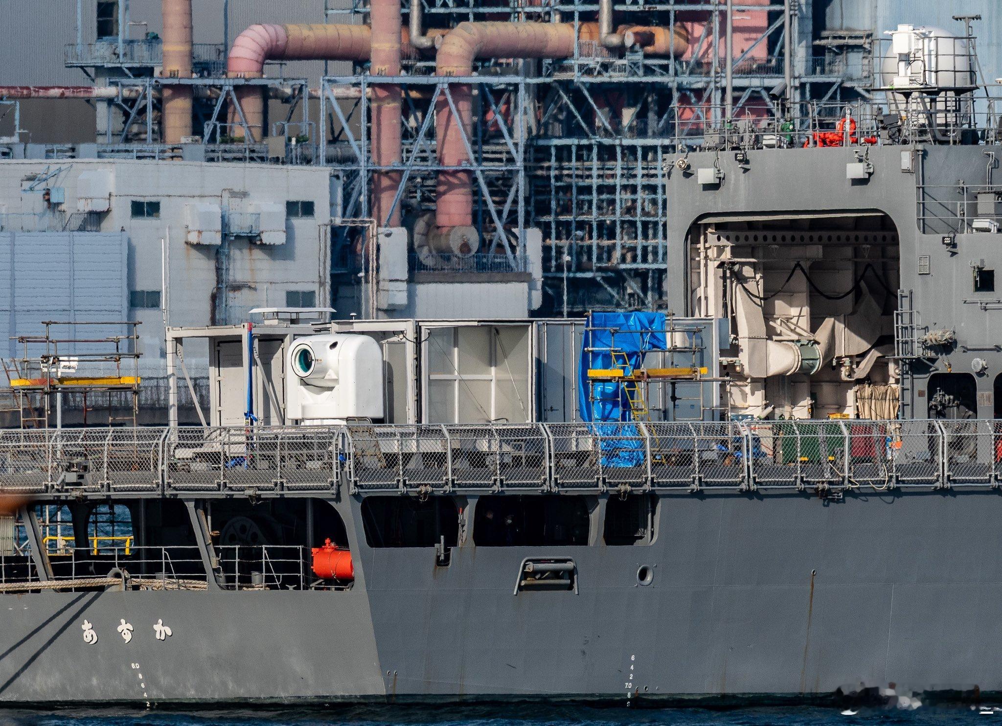 配备 100kW 高功率激光器的海自“飞鸟”号试验舰正在横须贺等待海上测试。激光器的防护罩门被多次打开和关闭。此前安装在“飞鸟”号舰尾甲板的电磁炮已经拆除。海自动态